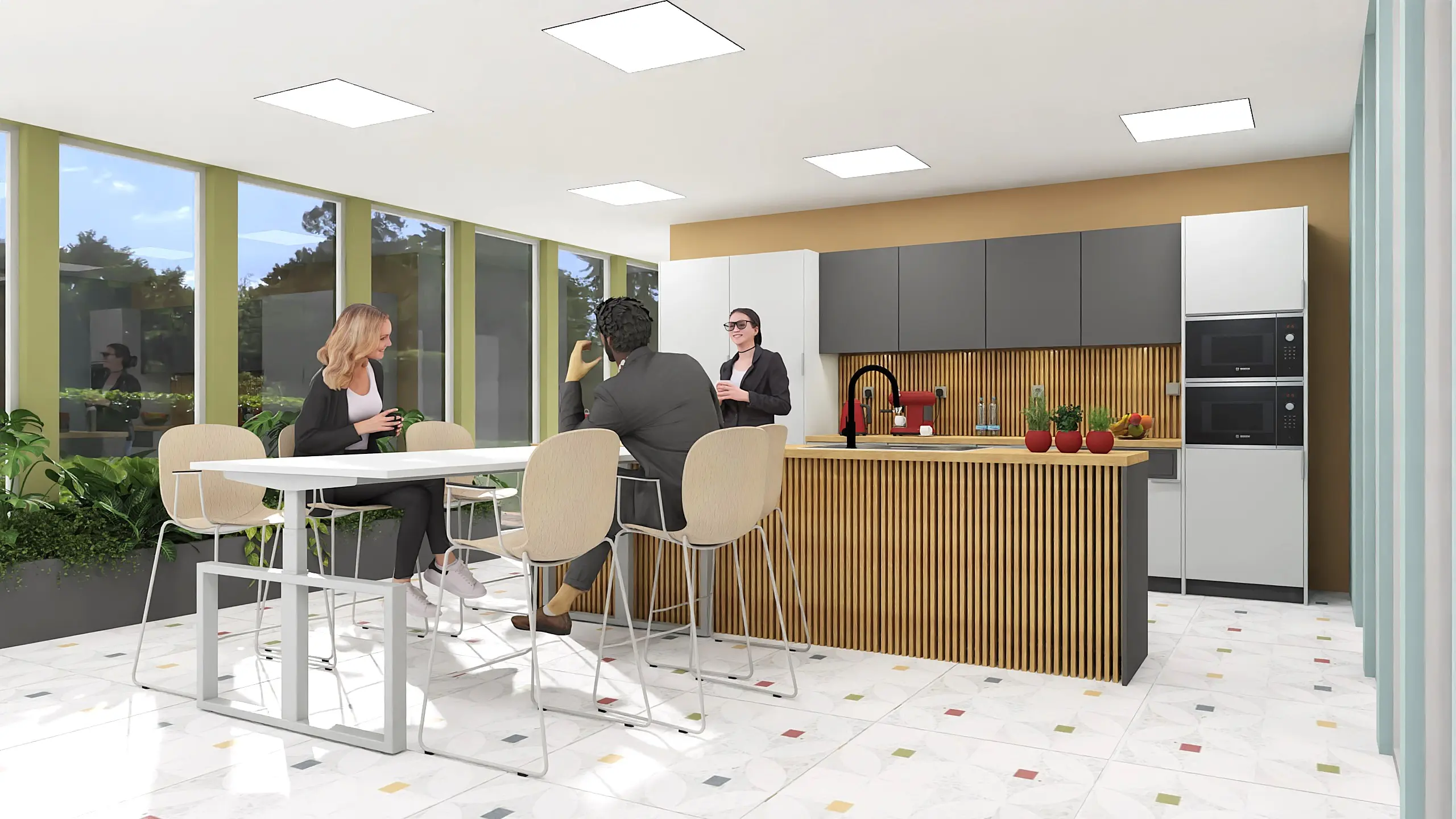 Diese Küchenlösung wurde konzipiert, um den Büroalltag aktiv zu unterstützen – funktional, offen und einladend. Perfekt für den Einsatz in Gemeinschaftszonen, Teamflächen oder informellen Besprechungsbereichen.