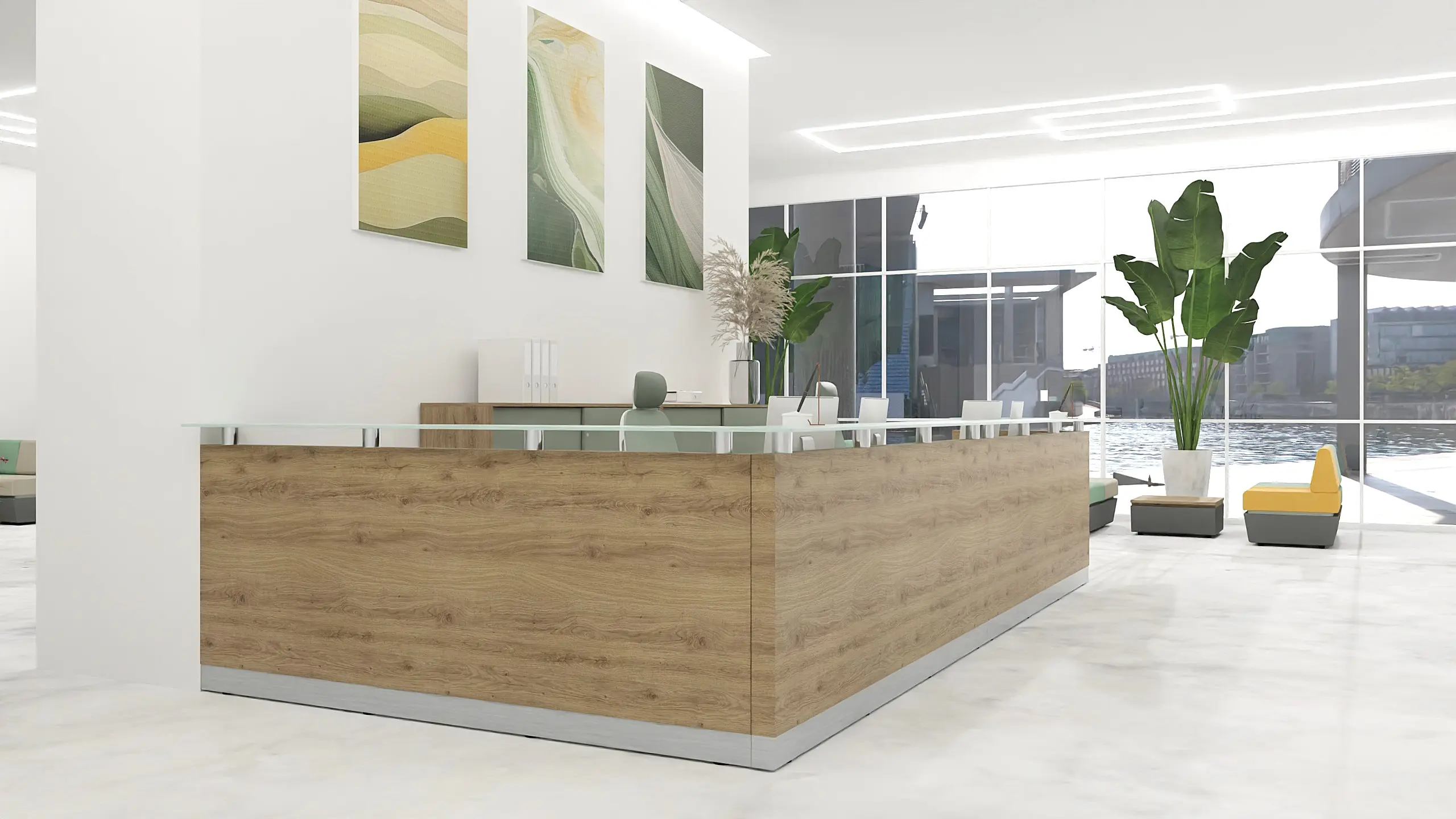 Diese Empfangslösung vereint Design, Funktion und Komfort – ideal für große Empfangsbereiche mit hohem Besucheraufkommen.