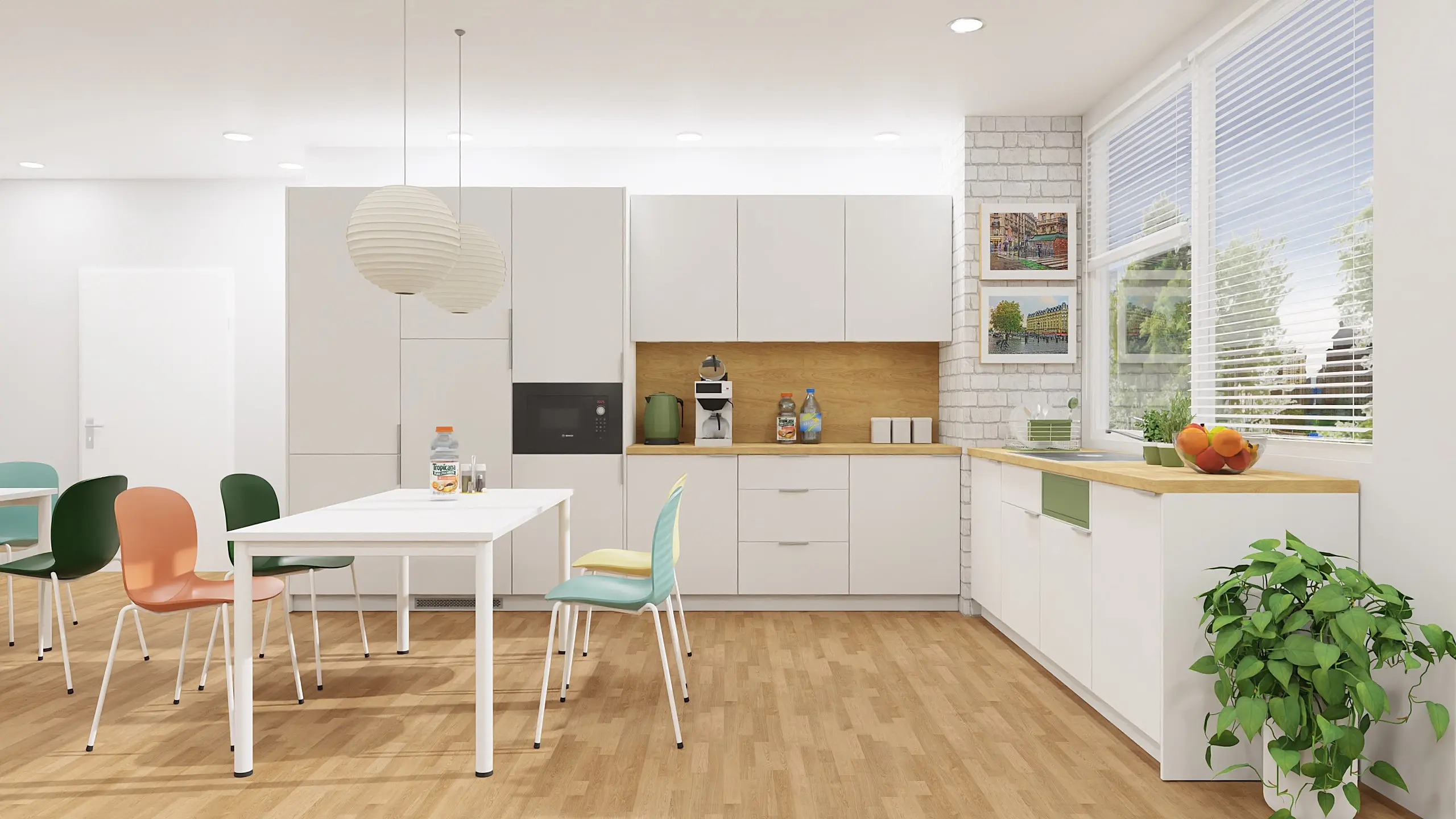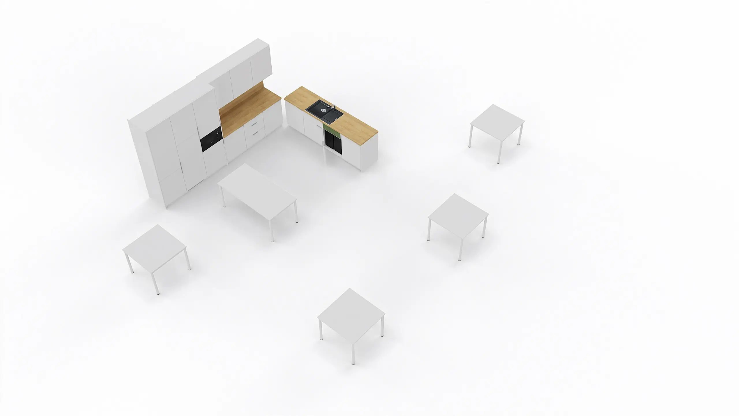 The well-thought-out layout is complemented by minimalist tables from the O-eM series – four square desks (900x900 mm) and one rectangular desk (1600x800 mm). Their white tabletops with laser edging and metal frames with height adjustment (740–820 mm) create five uniform stations for shared meals, coworking or short meetings. Thanks to this, the whole space becomes the true heart of the office – a place that brings people together.