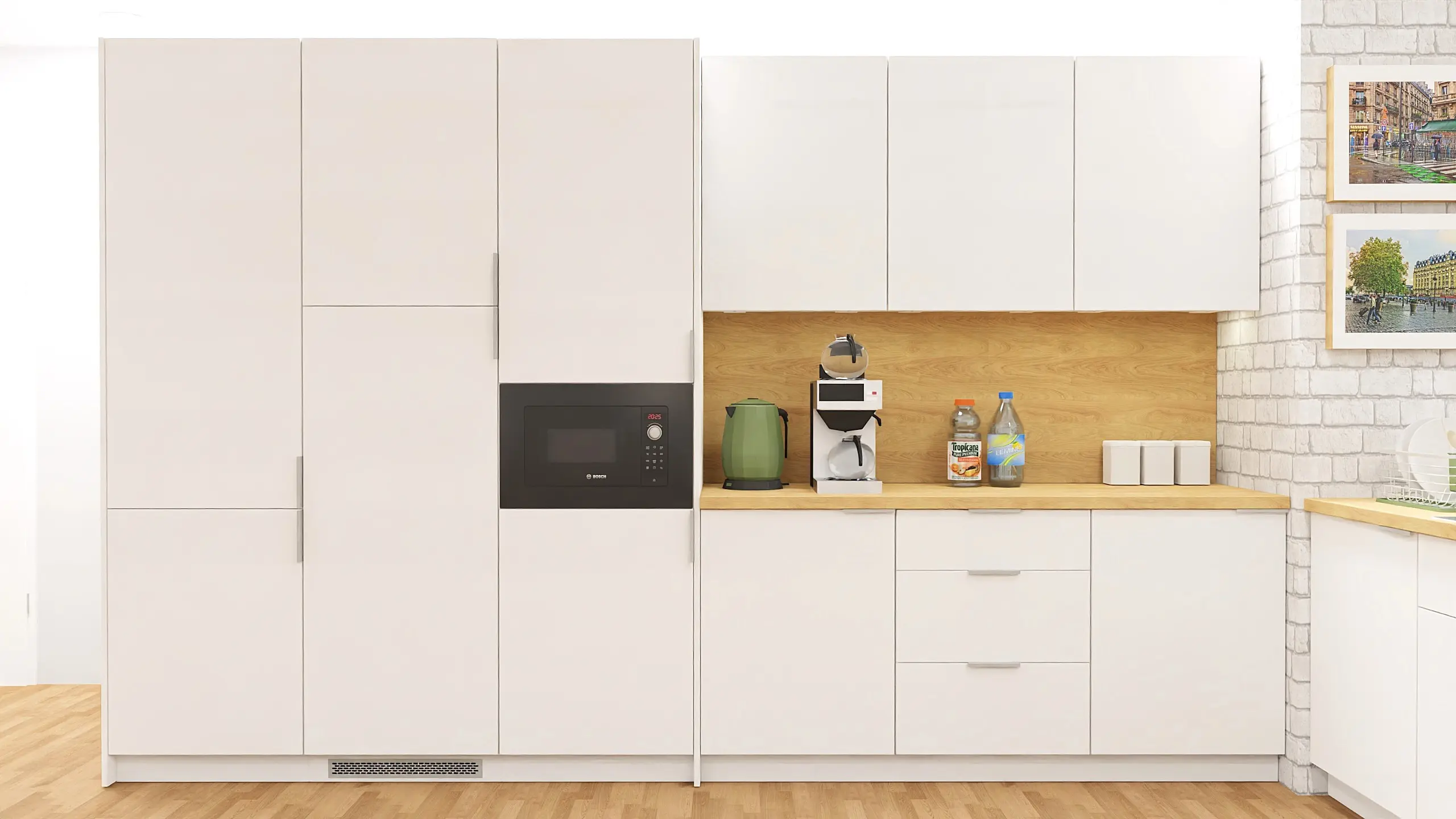 The unique CulinArt layout is based on two lines of built-in furniture. The first is a wall module with a worktop and white fronts. It contains base cabinets (with hinged doors, drawers and a waste module) and three modules of upper cabinets. It is complemented by three tall units, including one integrated with a microwave and two with shelves and hinged doors. The entire built-in structure on kitchen feet, with soft-closing hinges and laser-edged fronts, ensures not only aesthetics but also high manufacturing quality.