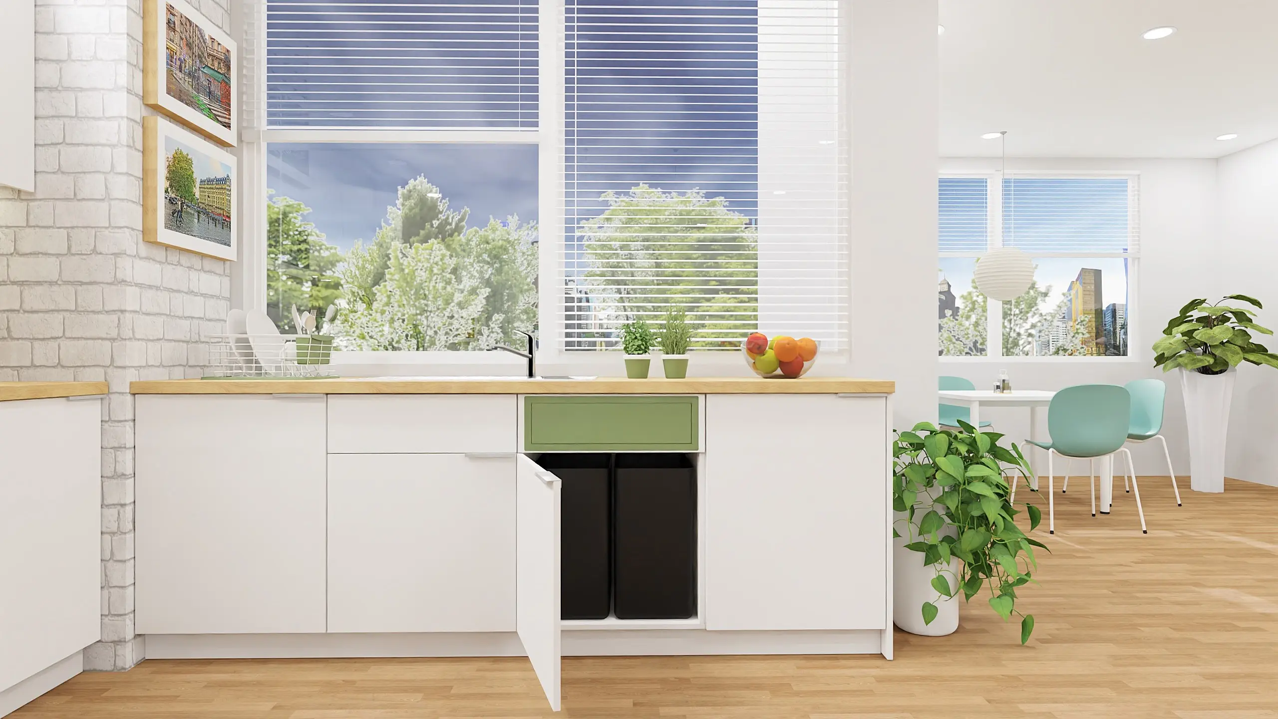 The second line of built-in furniture is a work island equipped with base cabinets (with hinged doors), a sink module with a drainer and an innovative waste cabinet with a chute. The whole setup is complemented by a kitchen tap.