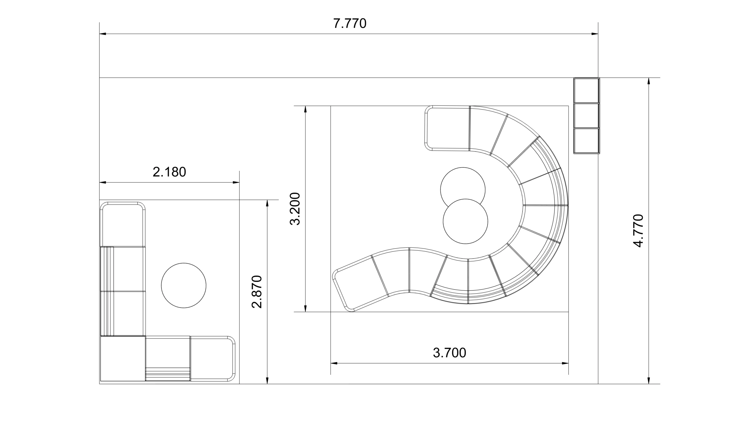 The furniture layout is based on Sitiq system modules and divided into two functional areas. The first – the curved zone – consists of curved modules: some of them have backrests, others do not, and additional full elements make it possible to create a cohesive, enclosed form. The whole is complemented by two round tables of different heights, which add lightness and make the space easy to use.