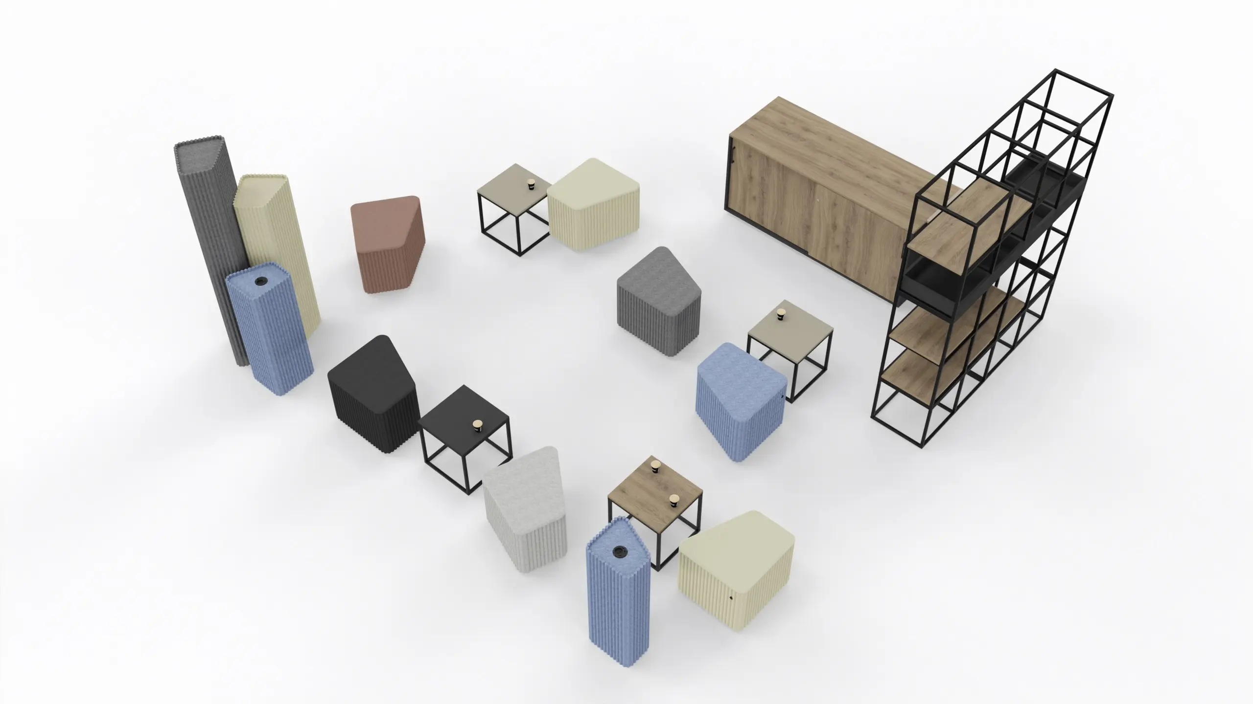 The dominant design theme features irregular, geometric shapes – triangular, oval, trapezoidal – adding visual dynamism and allowing for spontaneous furniture groupings. The setup is completed with bold shelving modules made from black steel mesh from the Aurora system, and a low cabinet with sliding doors in an elegant Natural Oak finish. The color palette, built on natural felts, beiges, soft blues, and black, brings softness and freshness to the space. Additionally, the area includes three acoustic columns (two with media ports), a waste bin, and practical planter trays that also serve as stylish space dividers. Built-in media ports ensure convenient device use, while the space imposes no formality – sit, stand, lean, chat, or simply rest.
