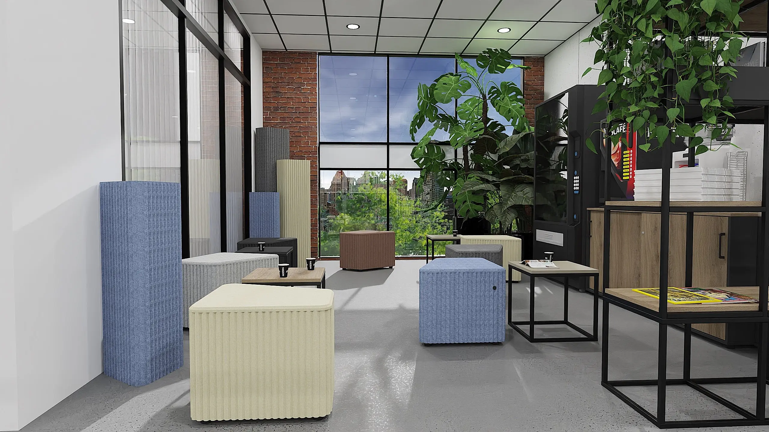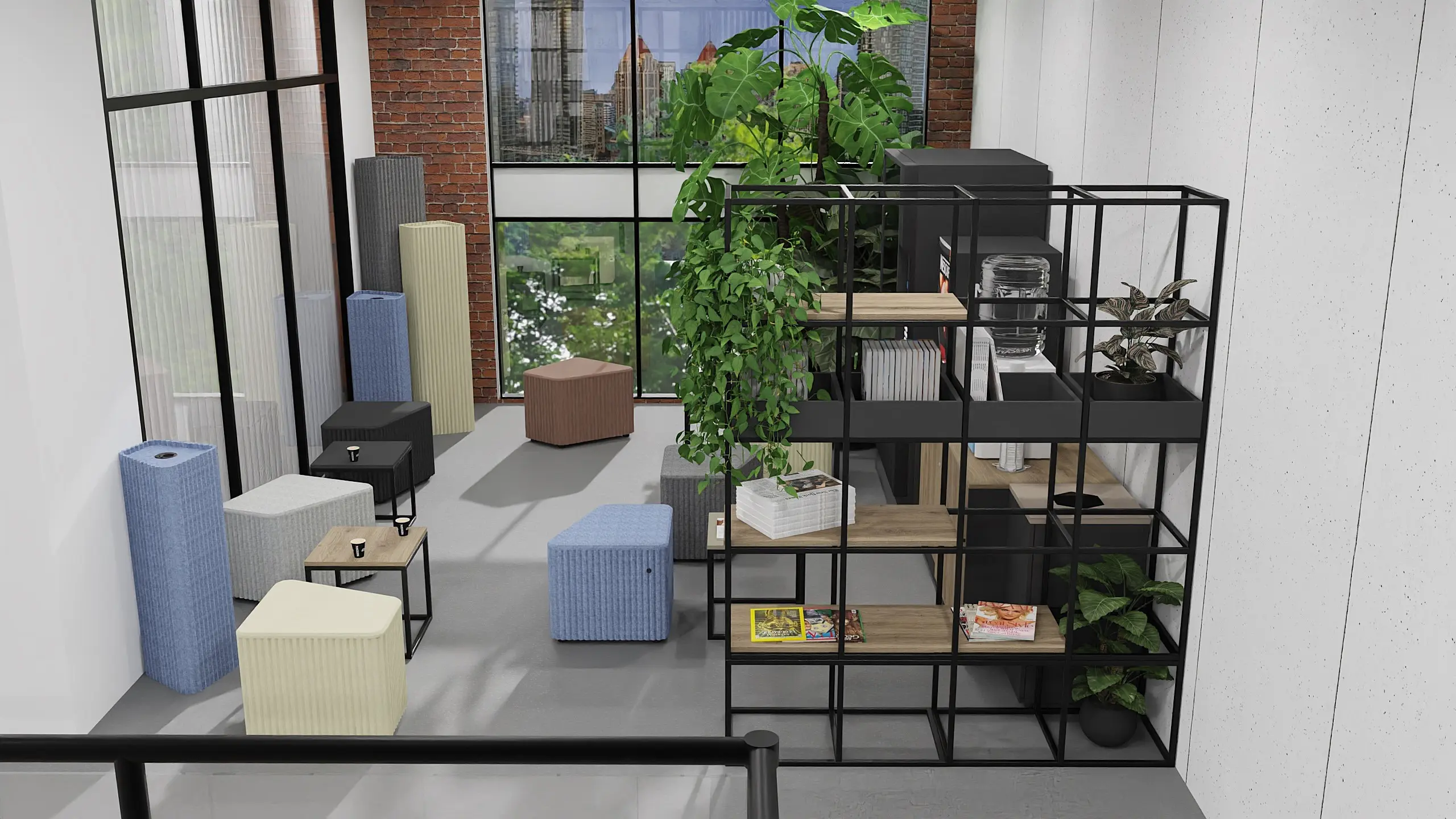 Coffee Point (18 m²) is a space that surprises with its energy and functionality despite its compact size. This modular setup is designed for intuitive and flexible use, built on lightweight, irregular poufs from the Favv collection, low side tables, and tall acoustic columns from the AcuTexo series. This composition creates an open, dynamic area that enables a range of scenarios – from quick conversations to a coffee break or charging your device.