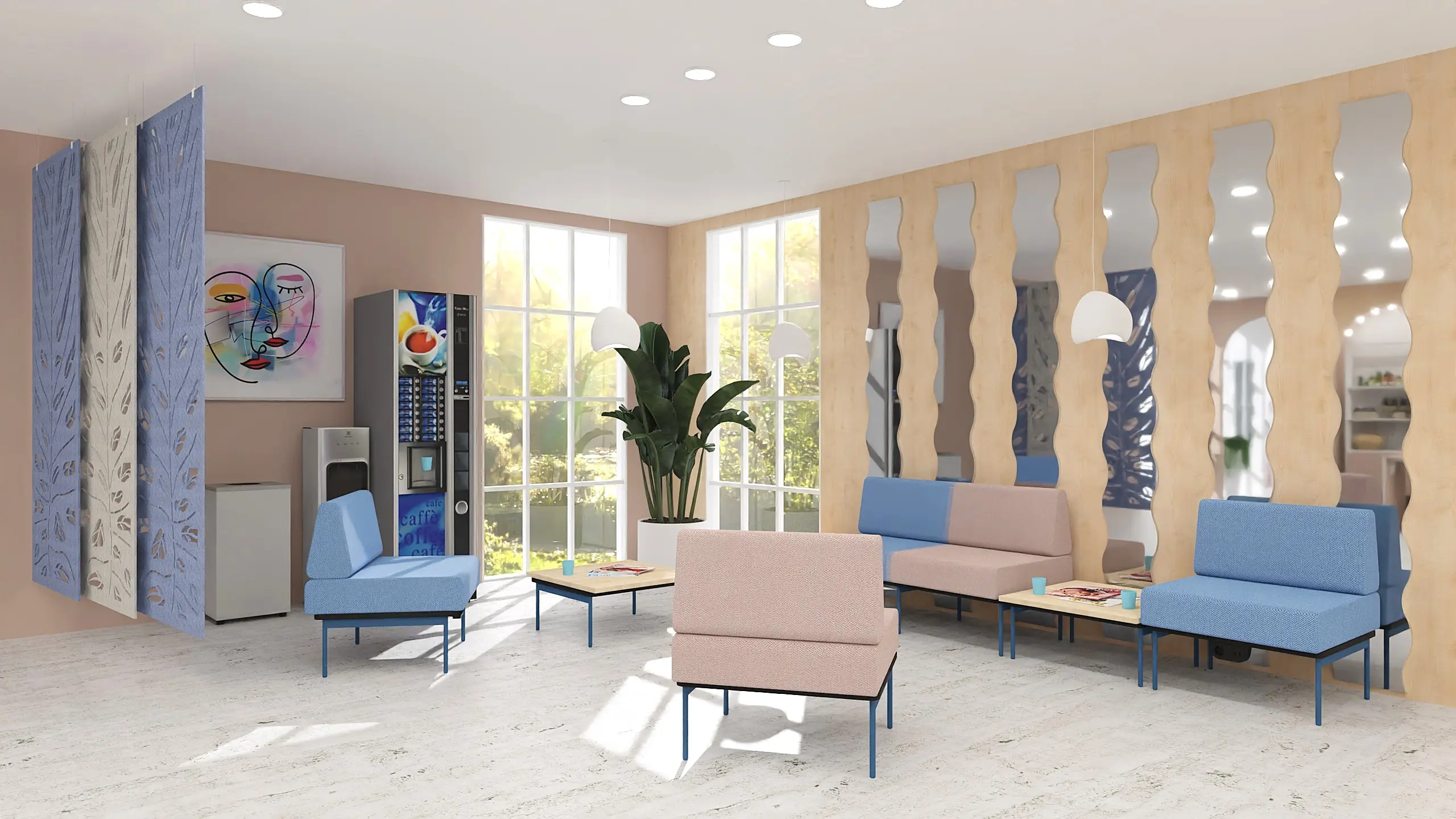 A key feature is the openwork, decorative Texo felt curtains, hung in the form of light, movable screens. Their organic, nature-inspired patterns give the space a striking yet calming character. Thanks to these felt dividers, the zone remains visually open while subtly defining areas – without the need for any permanent construction elements. The setup is complemented by an elegant waste-sorting bin, color-matched to the overall aesthetic.