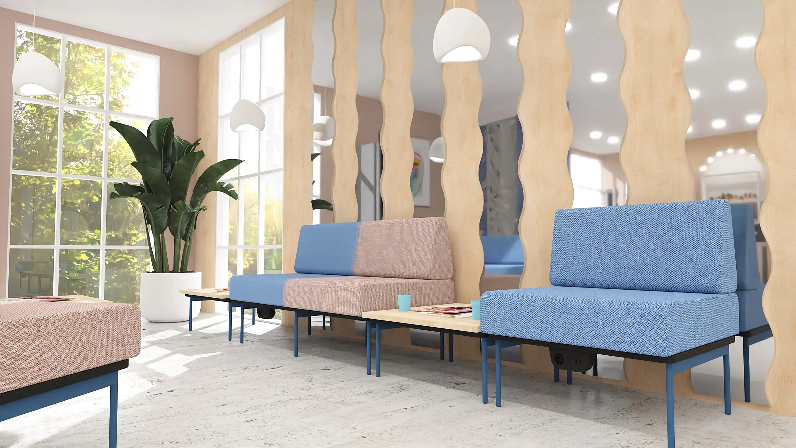 The design is built on a harmonious rhythm of forms and colors, created by lightweight modular seats from the MARO Sitiq collection in pastel ERA upholstery tones, paired with tables featuring light-colored tops. The whole arrangement brings a clean, fresh impression that positively enhances the interior atmosphere.