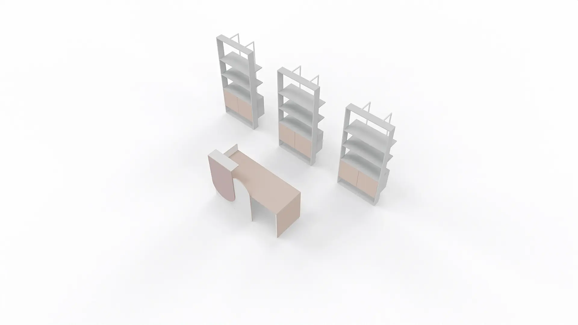 Accompanying the counter are three tall shelving units with a vertical design. Each unit includes a closed bottom section and open shelves above, ideal for displaying brochures, plants, or decorative items. Light contrasting finishes and white details highlight the contemporary aesthetic.