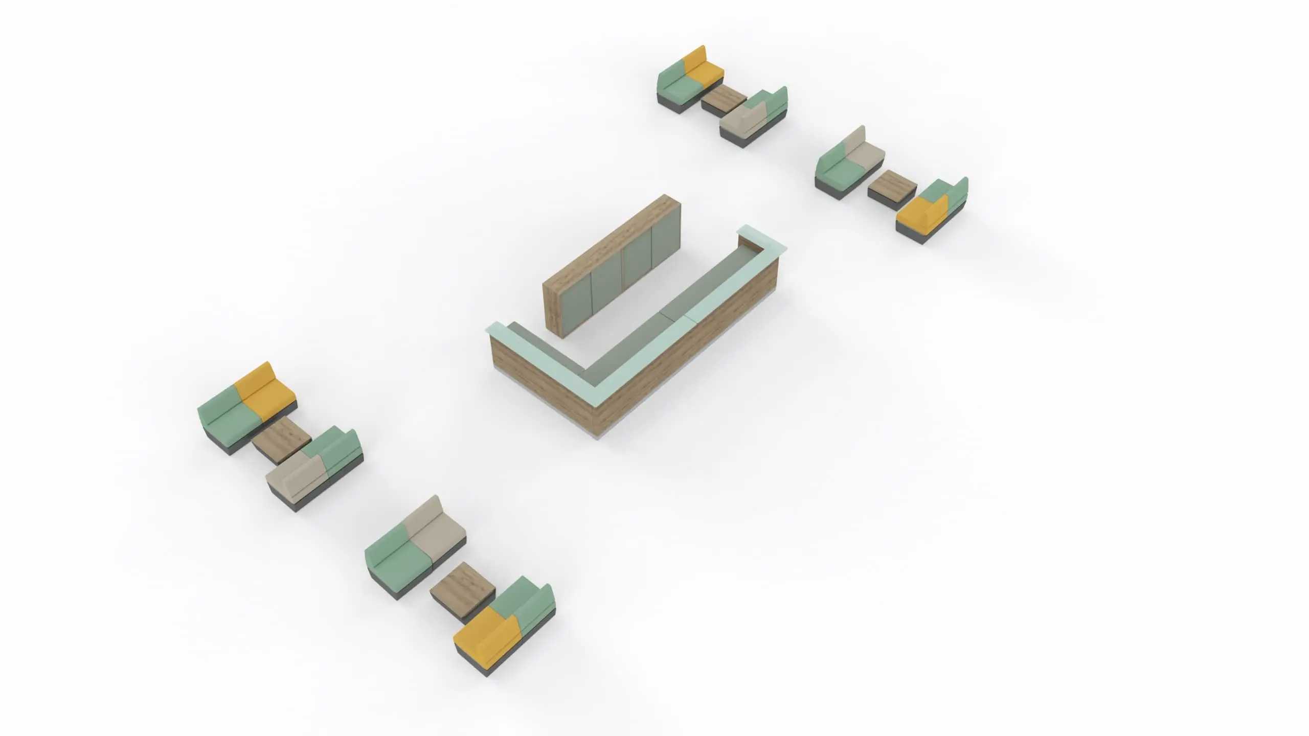 Surrounding the desk are eight compact guest seating zones. Each includes two sofa modules and a low table, creating comfortable semi-private waiting areas. Alternating fabric tones give the space a modern rhythm and welcoming ambiance.