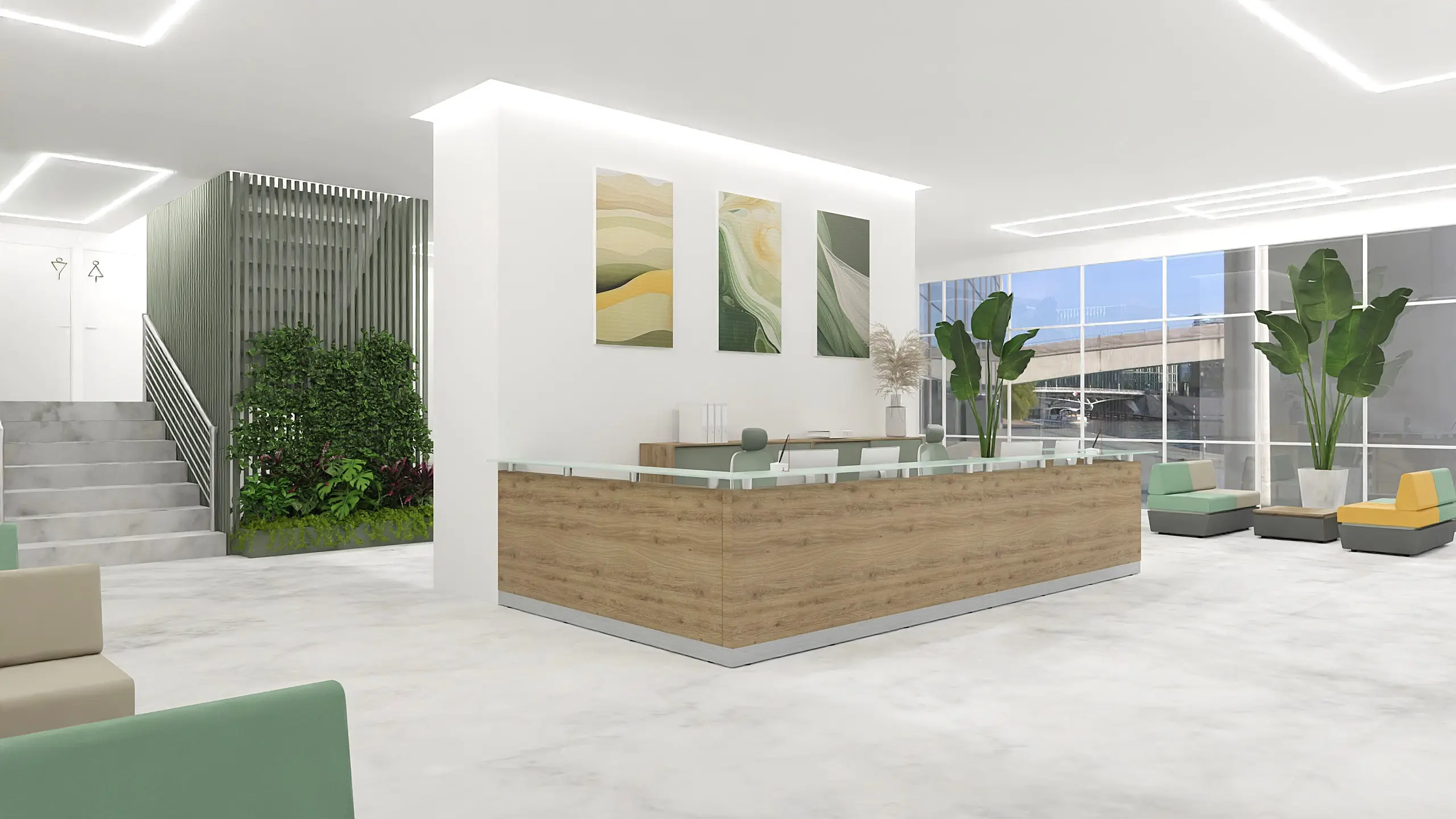 The Emelka reception space is designed for high foot traffic and multifunctional use. This 99 m² layout combines modern design with practicality — perfect for clinics, business centers, or institutions where first impressions matter.