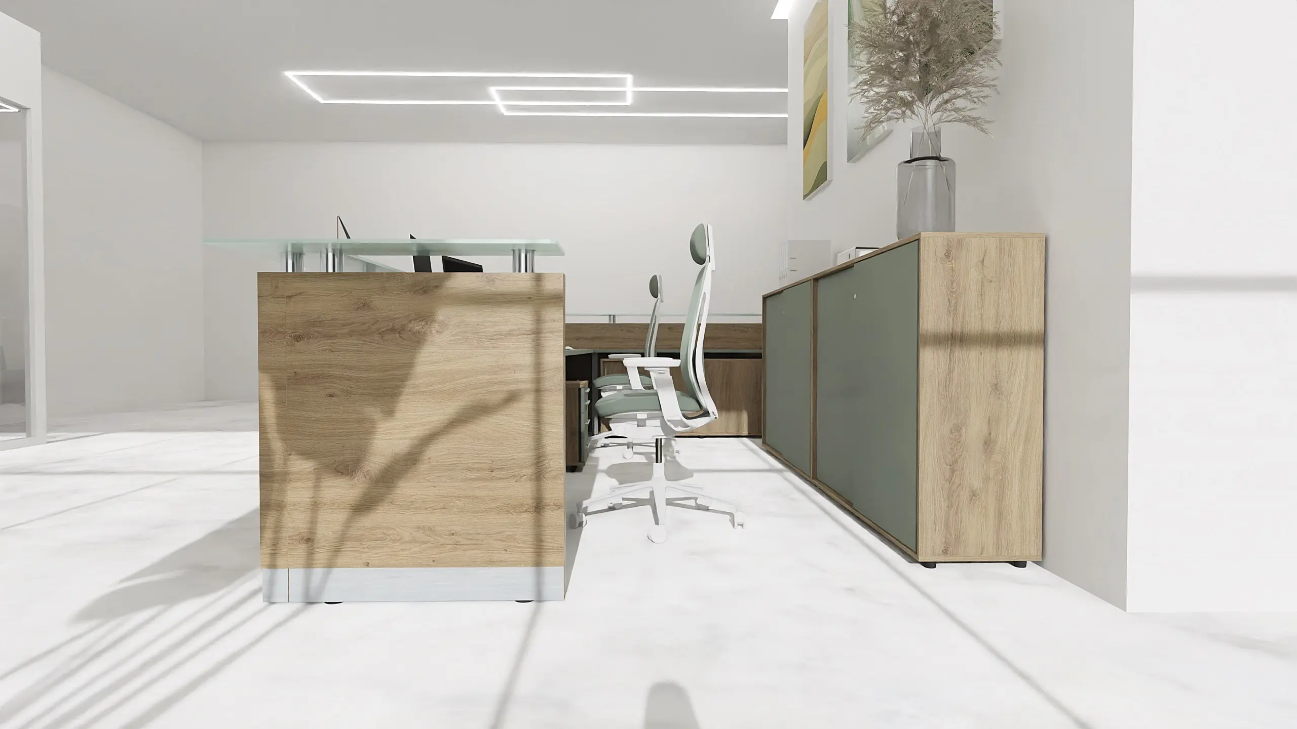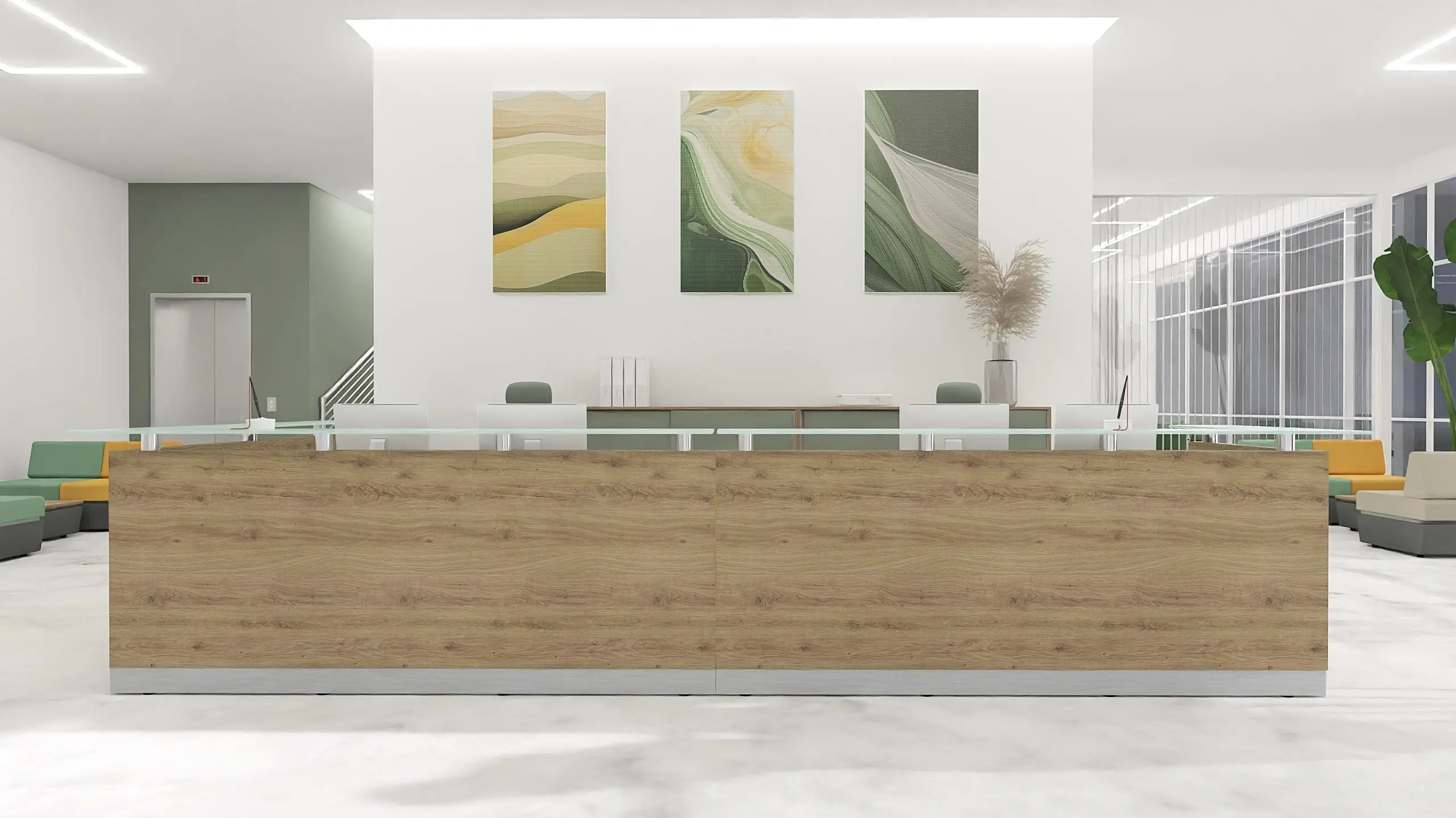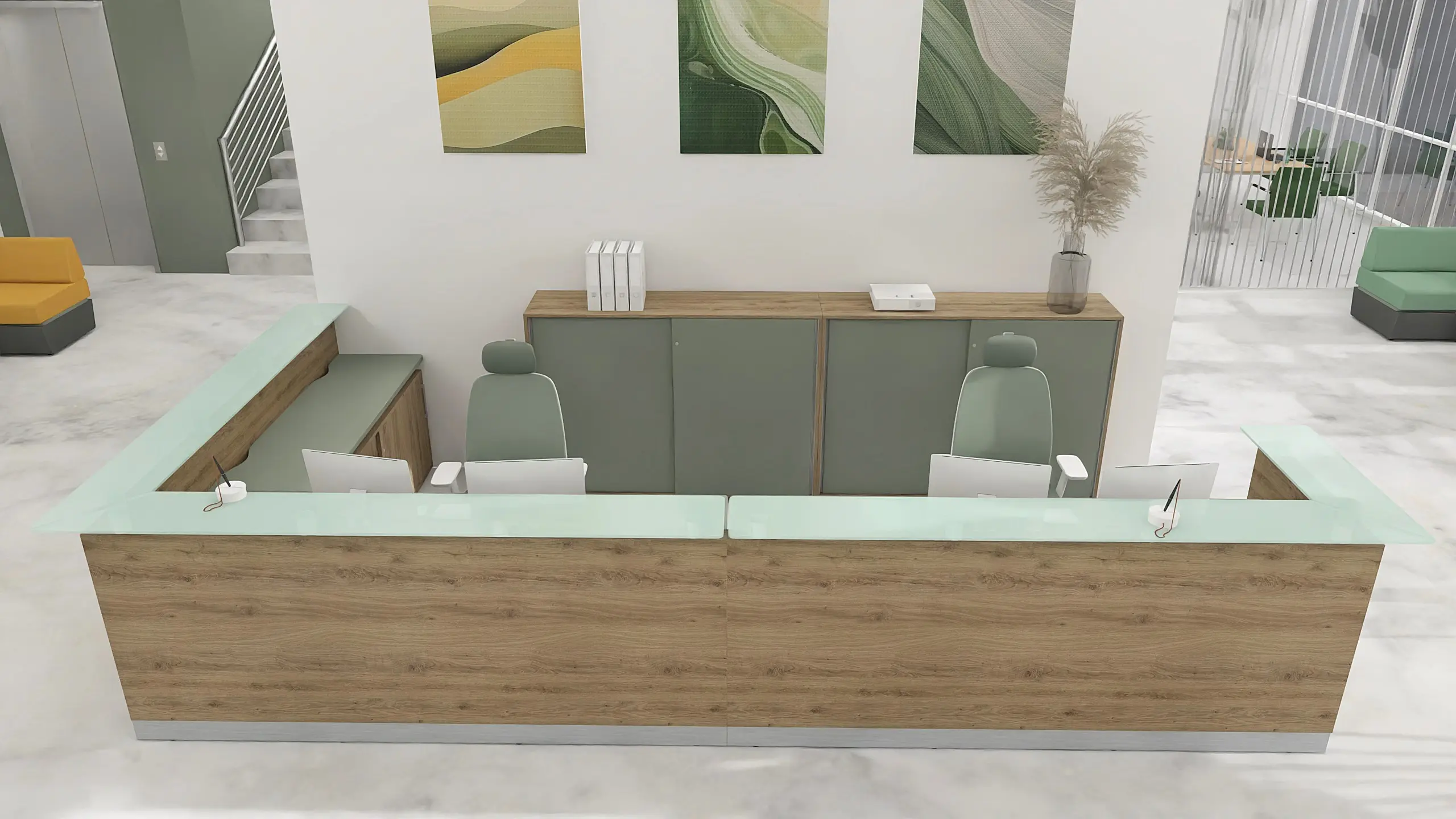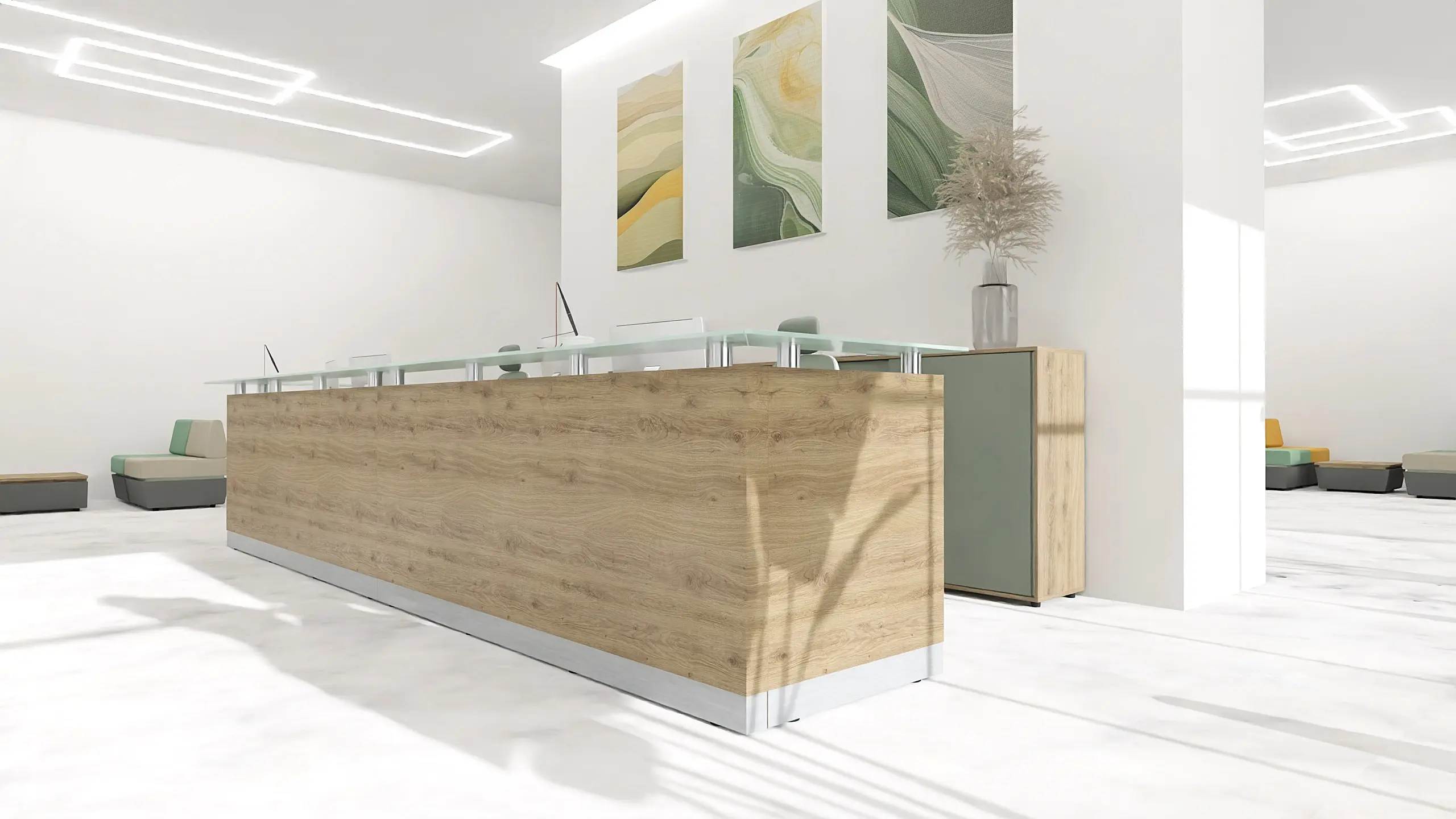 At the heart of the space is a striking L-shaped reception desk. Its wood-look front and mint-colored top strike a balance between professionalism and warmth. The height is optimized for serving guests while standing, and it offers an ergonomic setup for two staff members. Behind the desk, a wall made of three upholstered panels, color-matched to the lounge seating, adds acoustic comfort and a decorative backdrop.