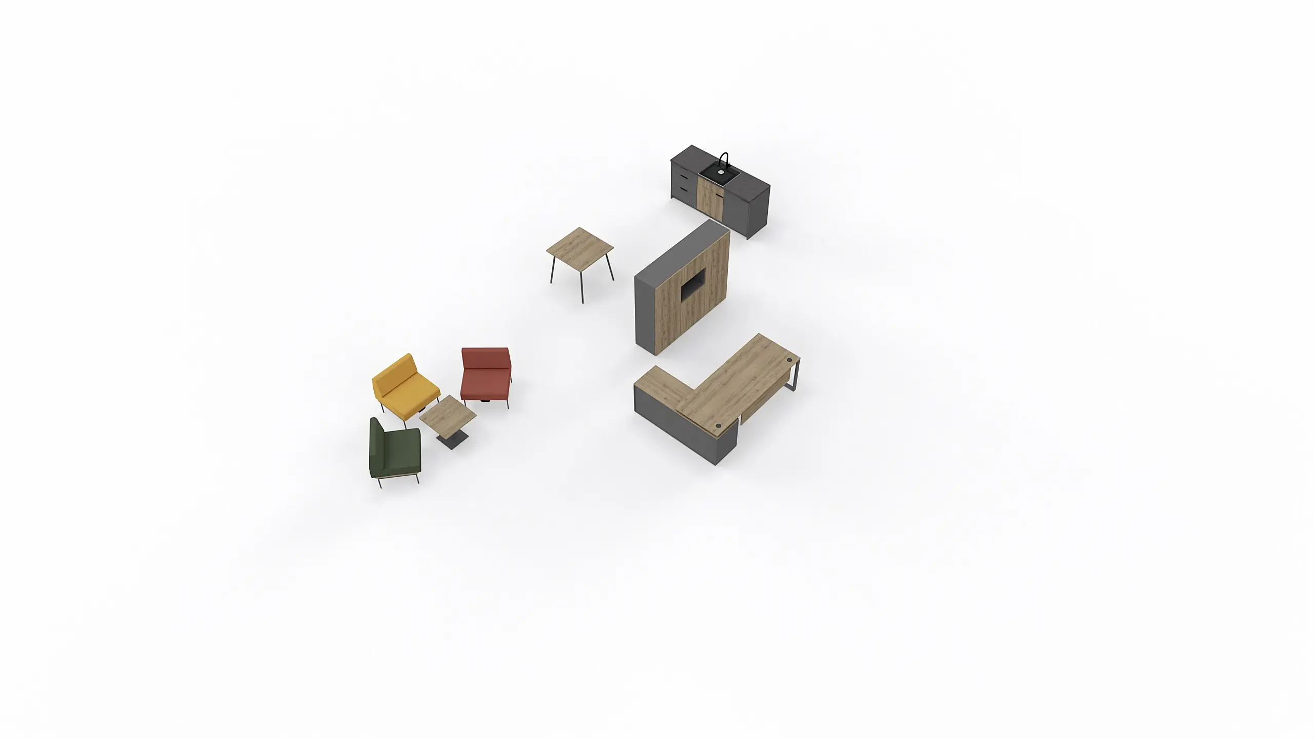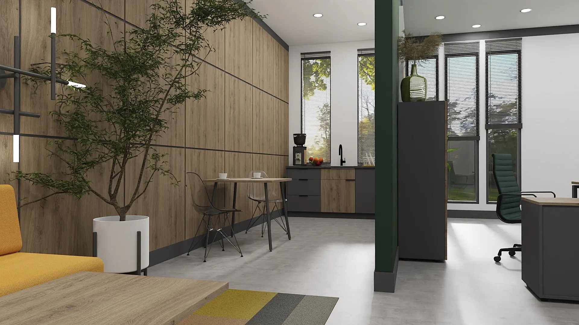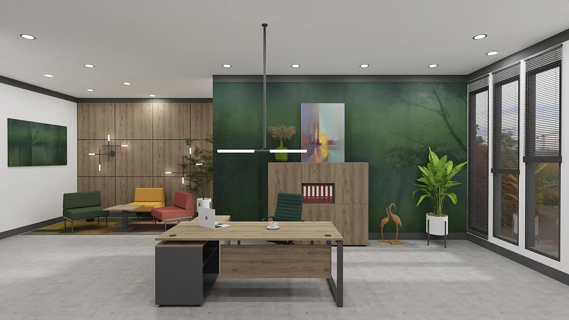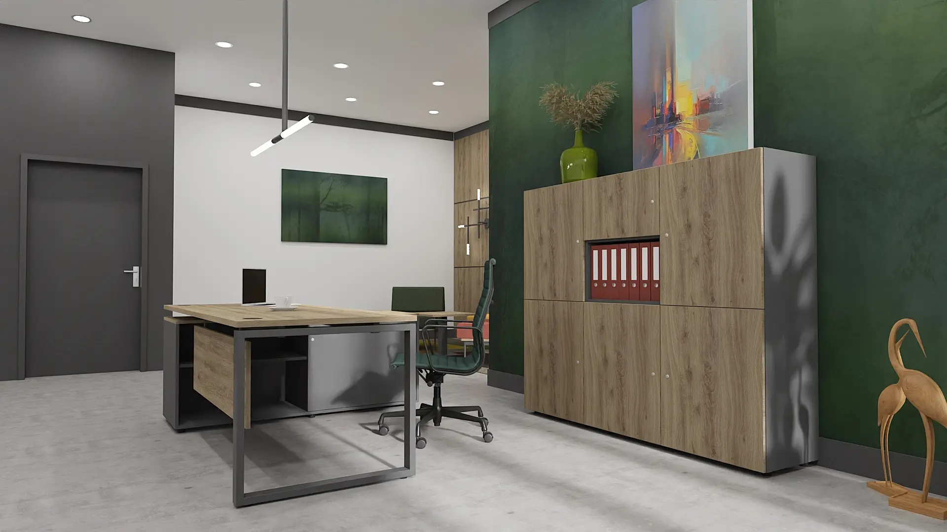 The color scheme, based on oak and graphite with mustard and terracotta accents, gives the space a friendly, energetic character. This project is ideal for professionals seeking a relationship-based management style while maintaining a practical, independent office setup. It's a perfect fit for executive offices, legal practices, or as a dedicated hybrid meeting zone.