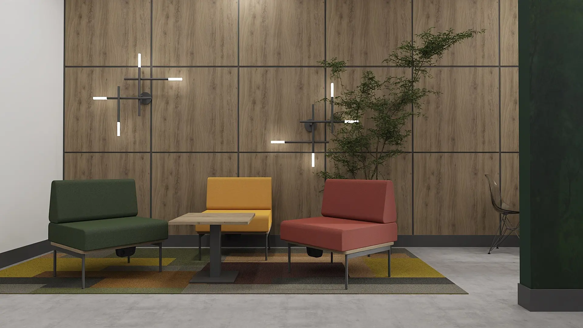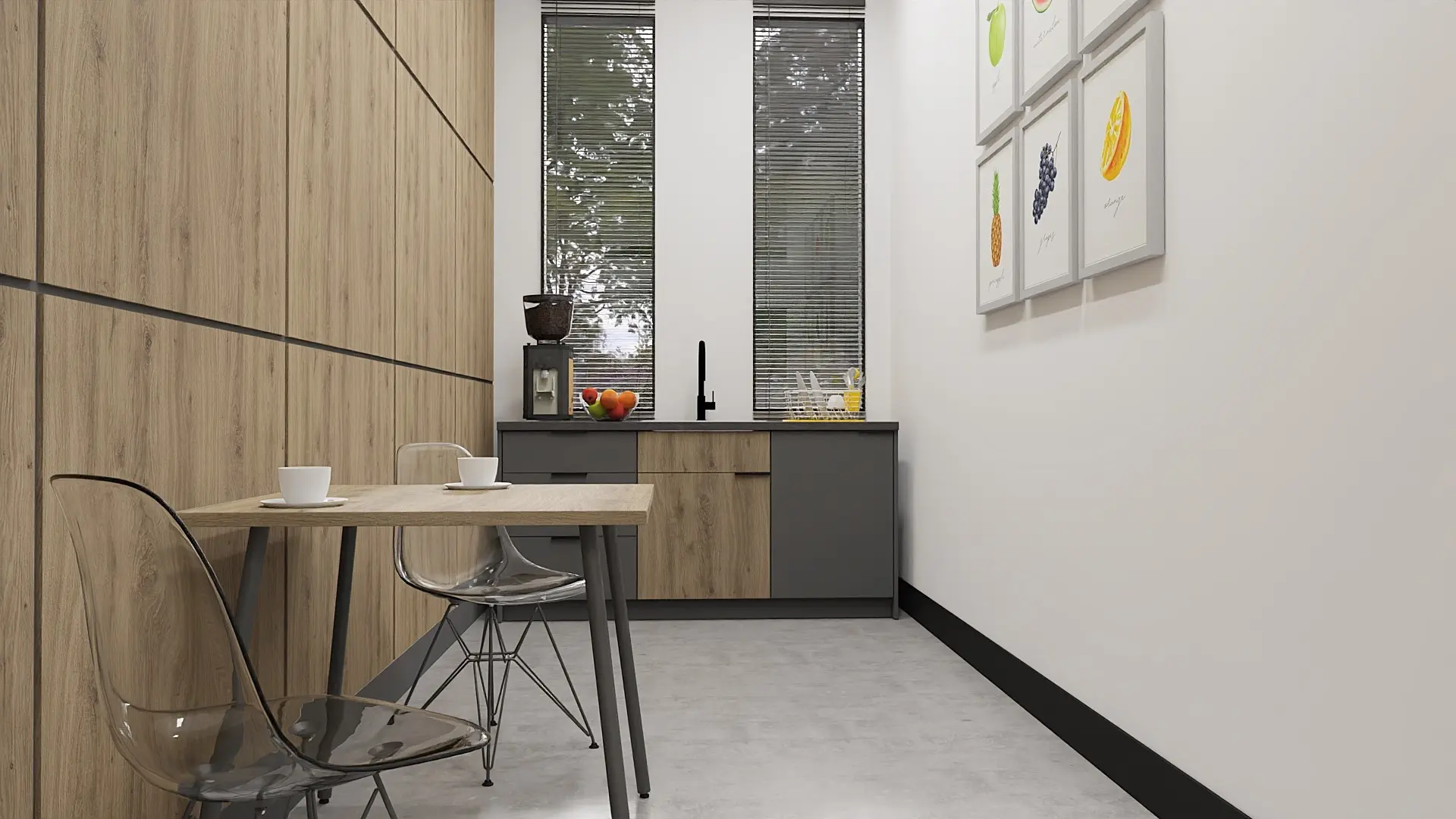 The social zone includes a compact yet fully equipped CulinArt kitchenette with lower cabinets, a sink, a Franke faucet, plinth, and side panels – complemented by a dining table (800x800 mm) from the same collection. Flanked by seating space, it offers room for quick interactions or casual meals. The relaxation area features three comfortable upholstered MARO Sitiq armchairs in colorful fabrics and a coffee table from the Idea S collection (600x600 mm), creating an inviting spot for informal conversations and unwinding.