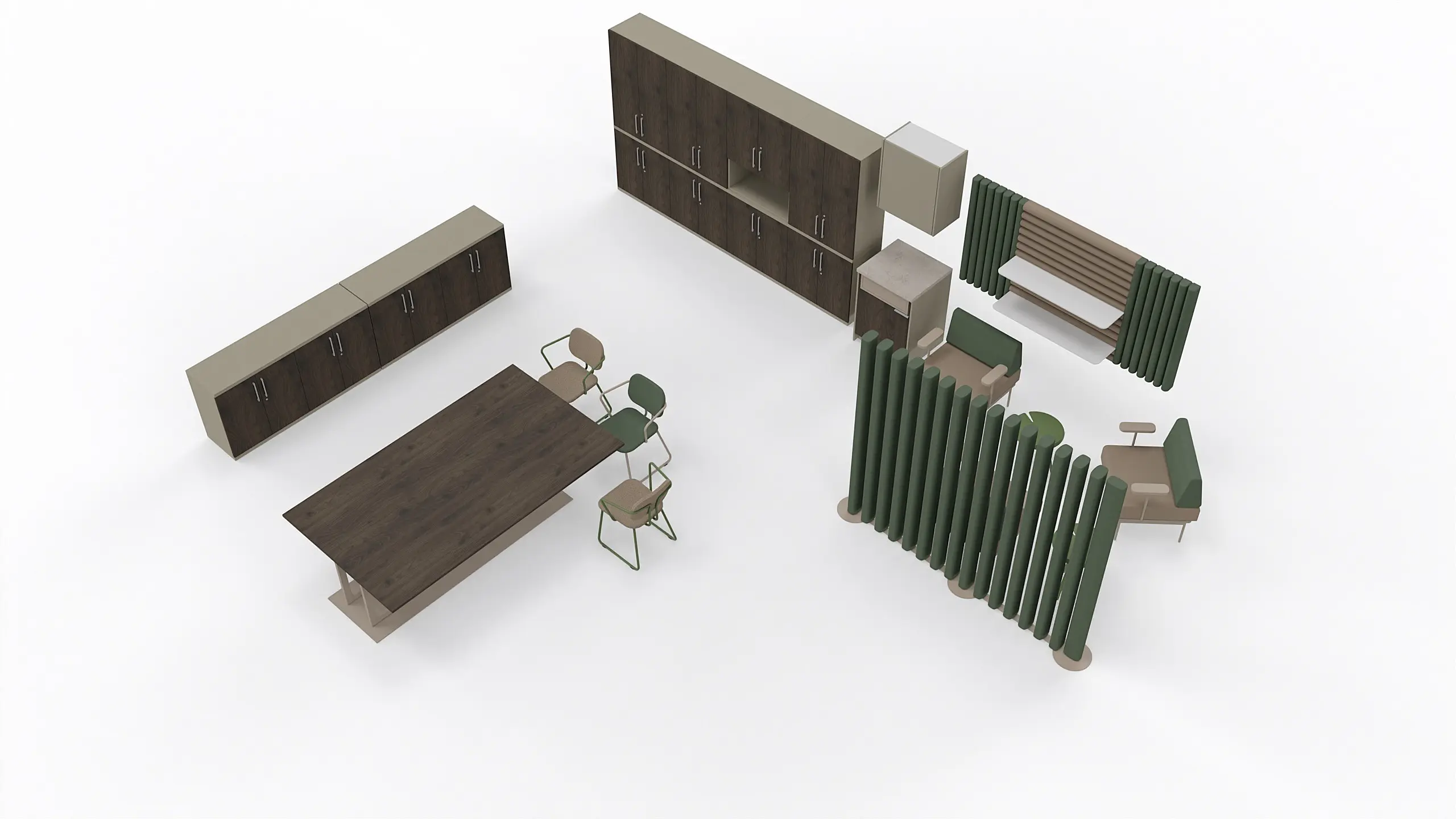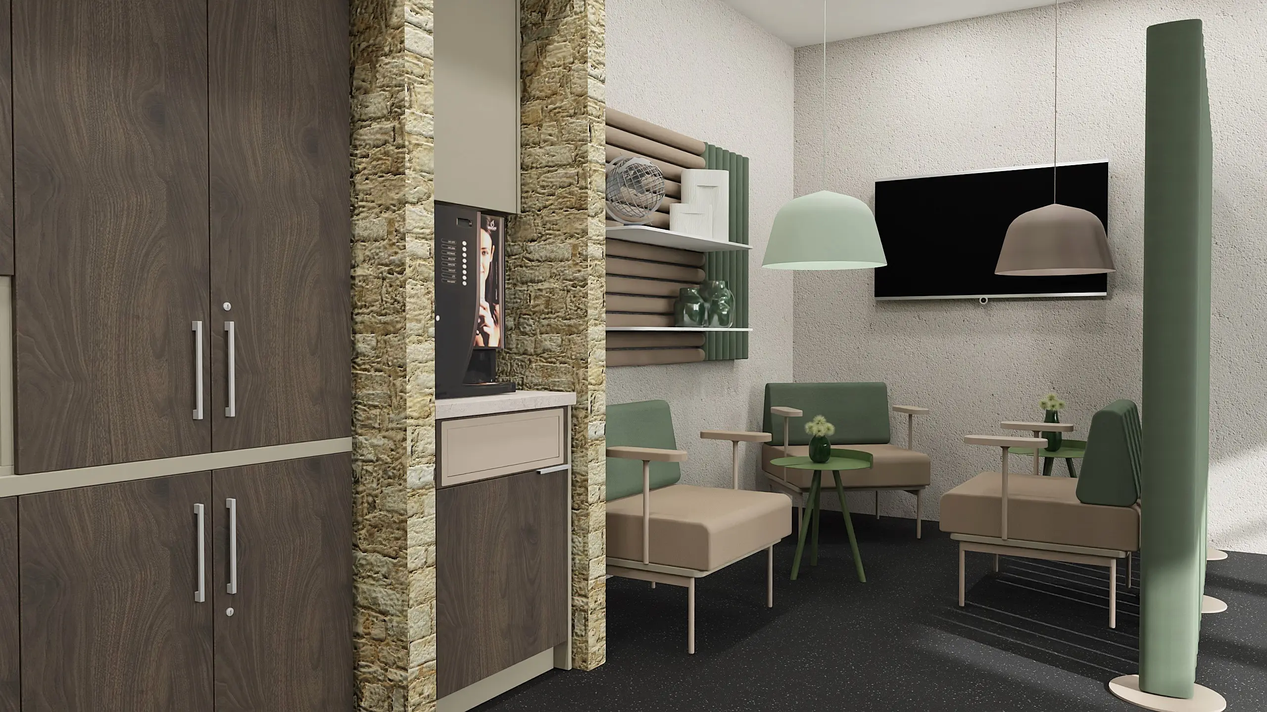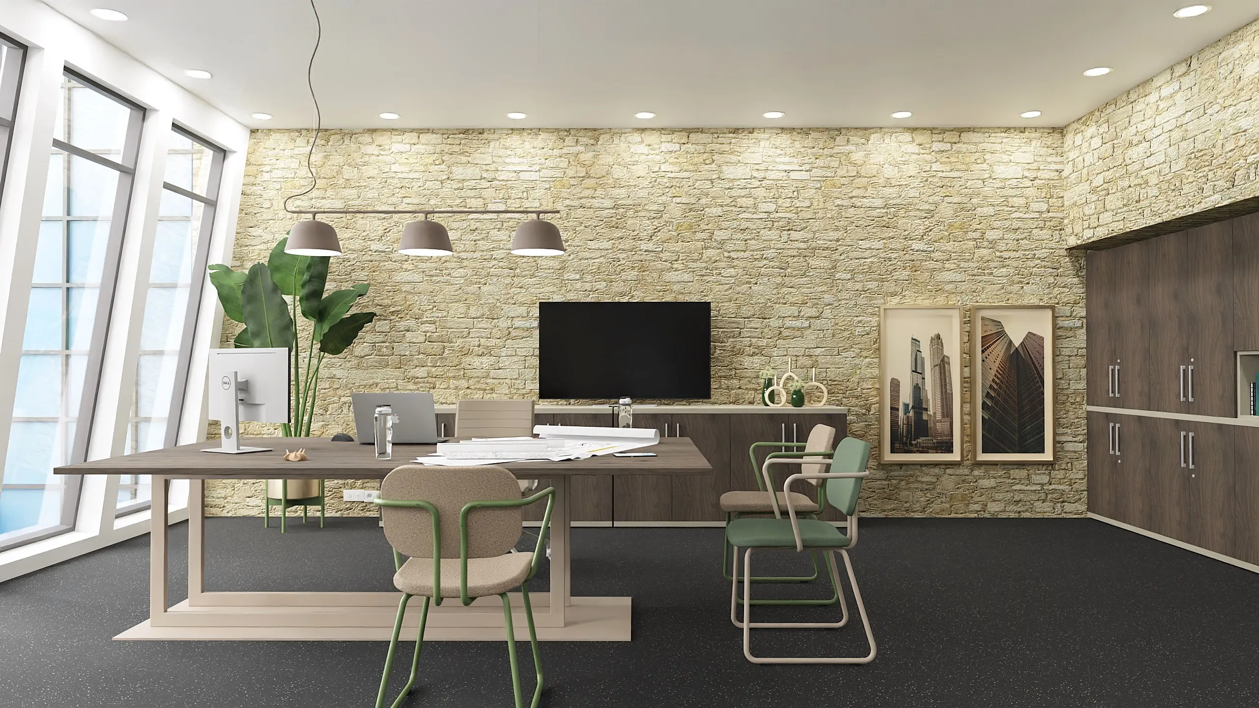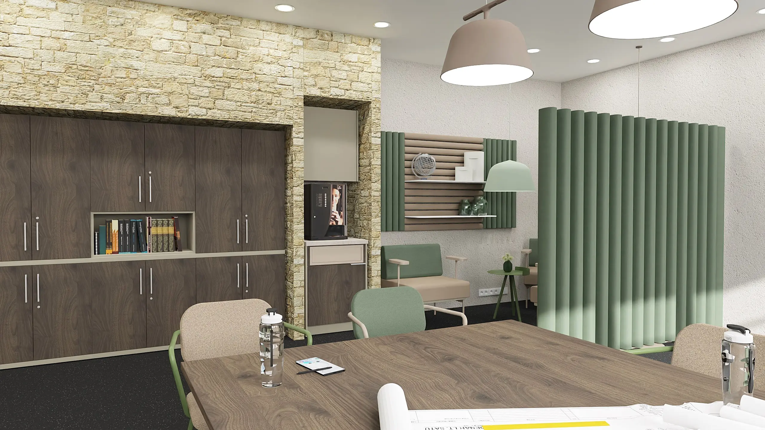 The space is softly divided by Texo felt curtains, which significantly improve acoustics while adding a visual rhythm. The natural-inspired color palette – muted greens, walnut, beige, and olive – brings a calm and prestigious character to the interior. With its clear zoning and high-quality finishes, this layout is perfect for an executive space, director’s office, or prestige-oriented managerial workspace.