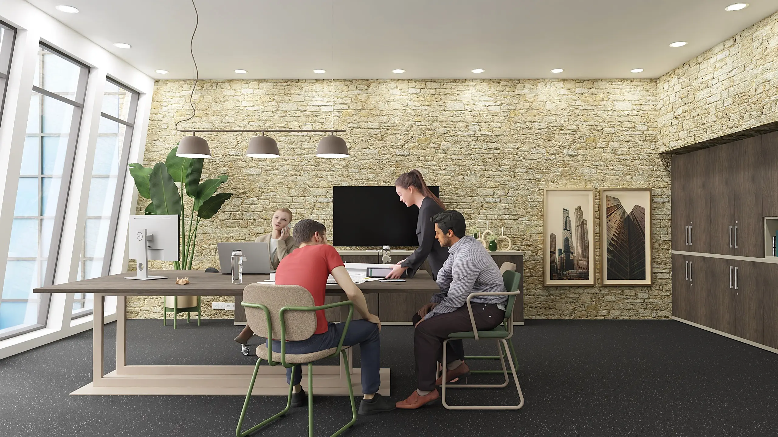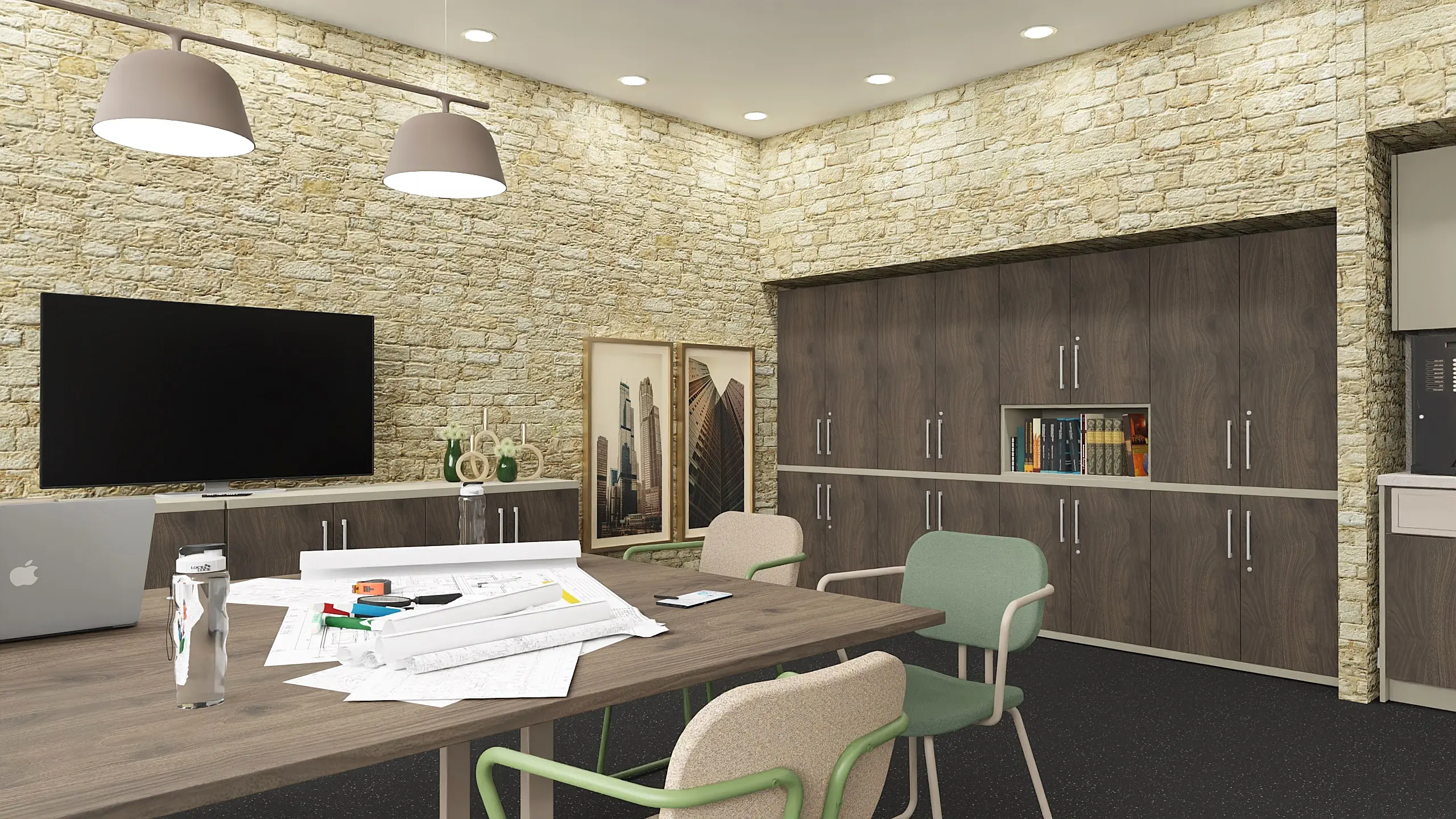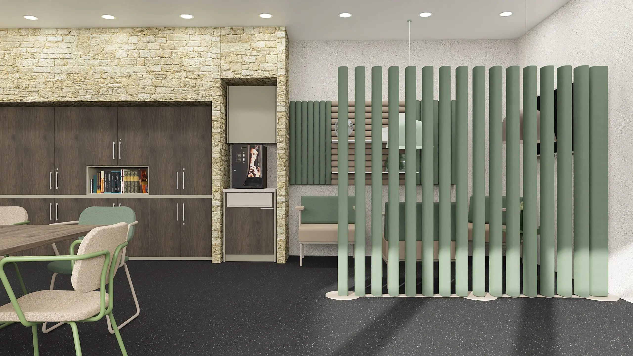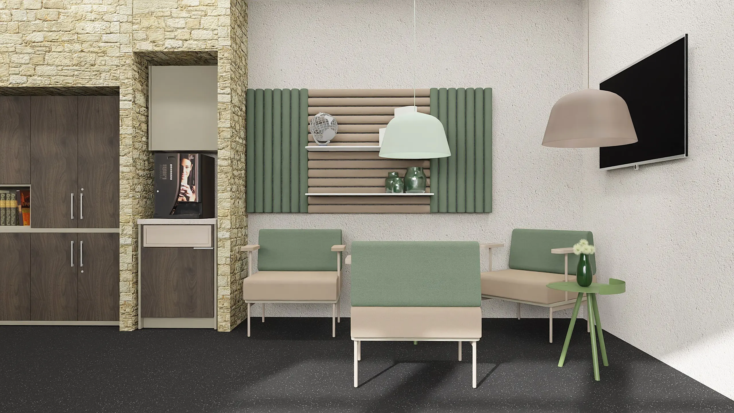 The space is softly divided by Texo felt curtains, which significantly improve acoustics while adding a visual rhythm. The natural-inspired color palette – muted greens, walnut, beige, and olive – brings a calm and prestigious character to the interior. With its clear zoning and high-quality finishes, this layout is perfect for an executive space, director’s office, or prestige-oriented managerial workspace.