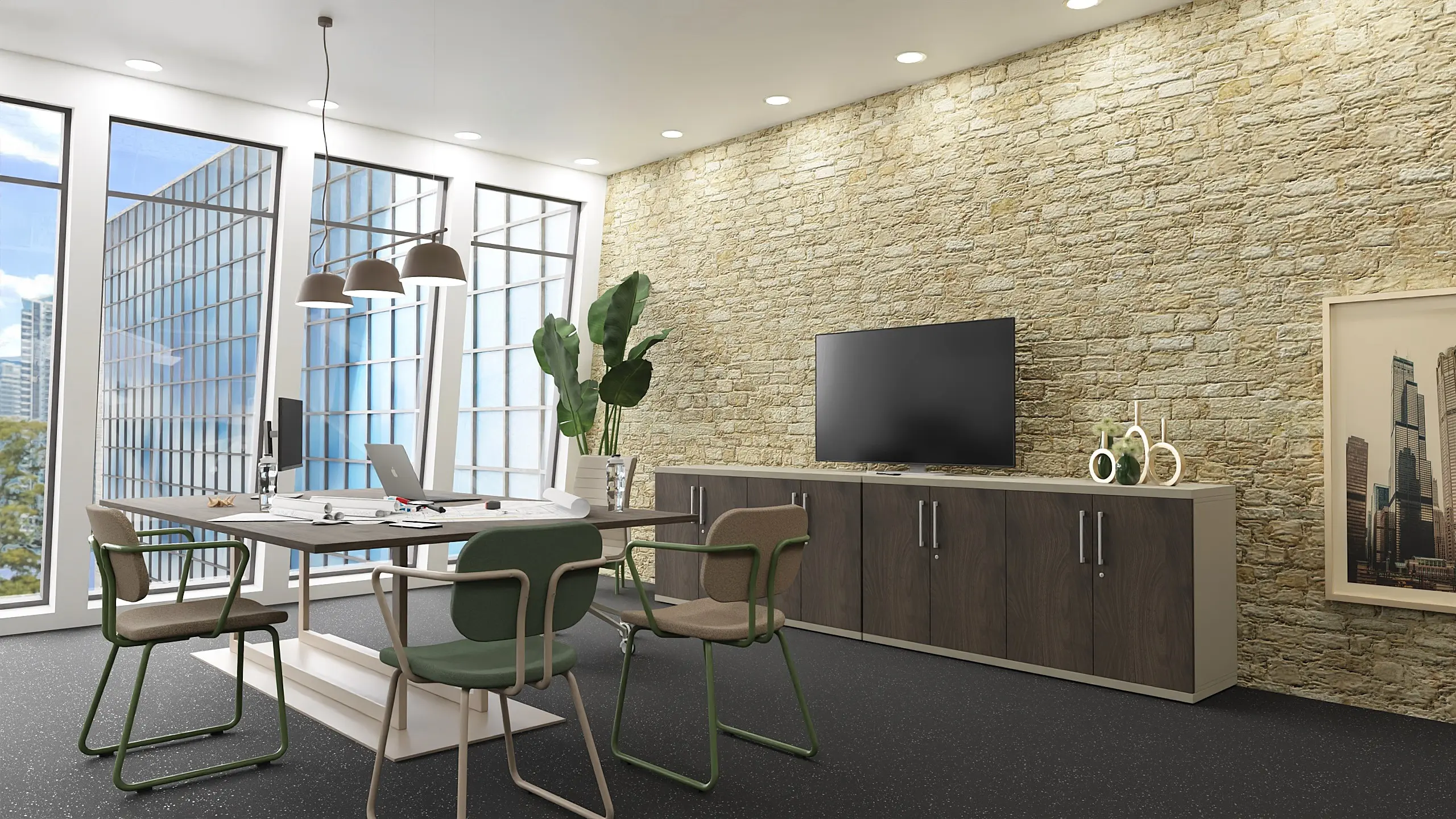 At the center of the main work zone is the sleek Toris desk (2200 mm long), paired with a practical side cabinet in warm walnut brown and beige tones. Comfort and posture support are ensured by the Giroflex 60 swivel chair, upholstered in natural leather. The storage zone features spacious Linea cabinets (2OH and 5OH) with beige fronts and walnut-brown top units, perfectly matching the color palette of the entire interior. Placed along the wall, the cabinets optimize space without disrupting the aesthetics of the room.