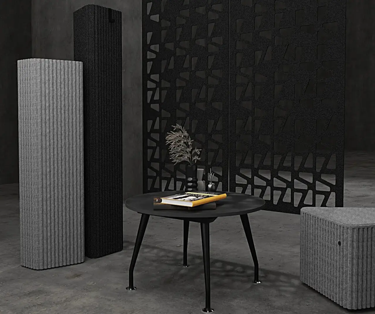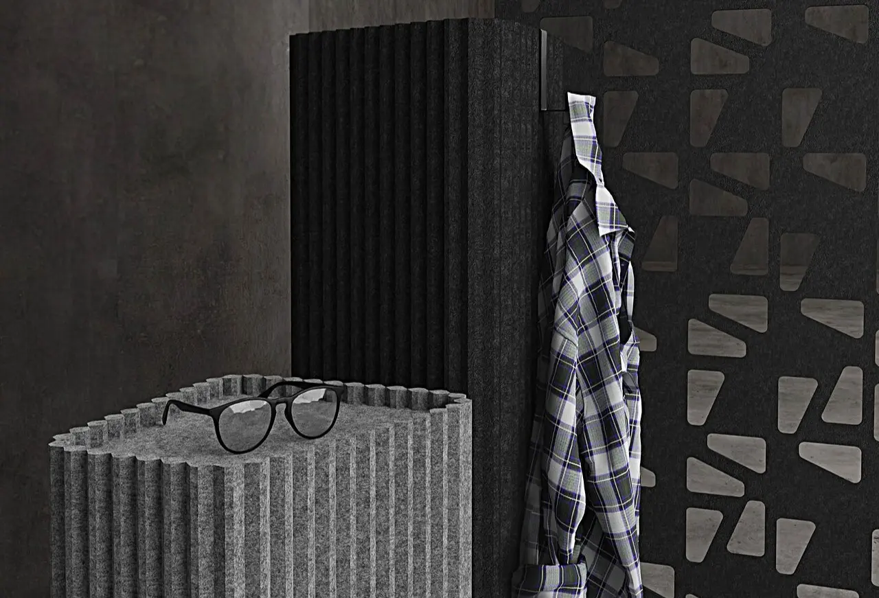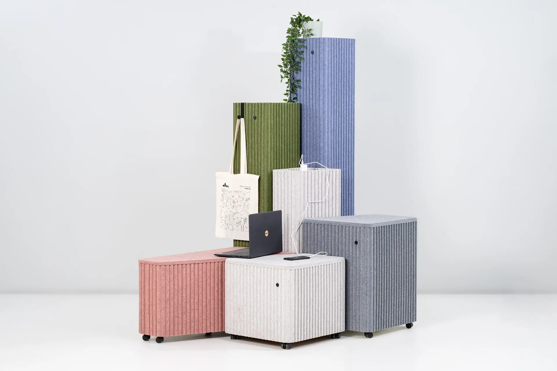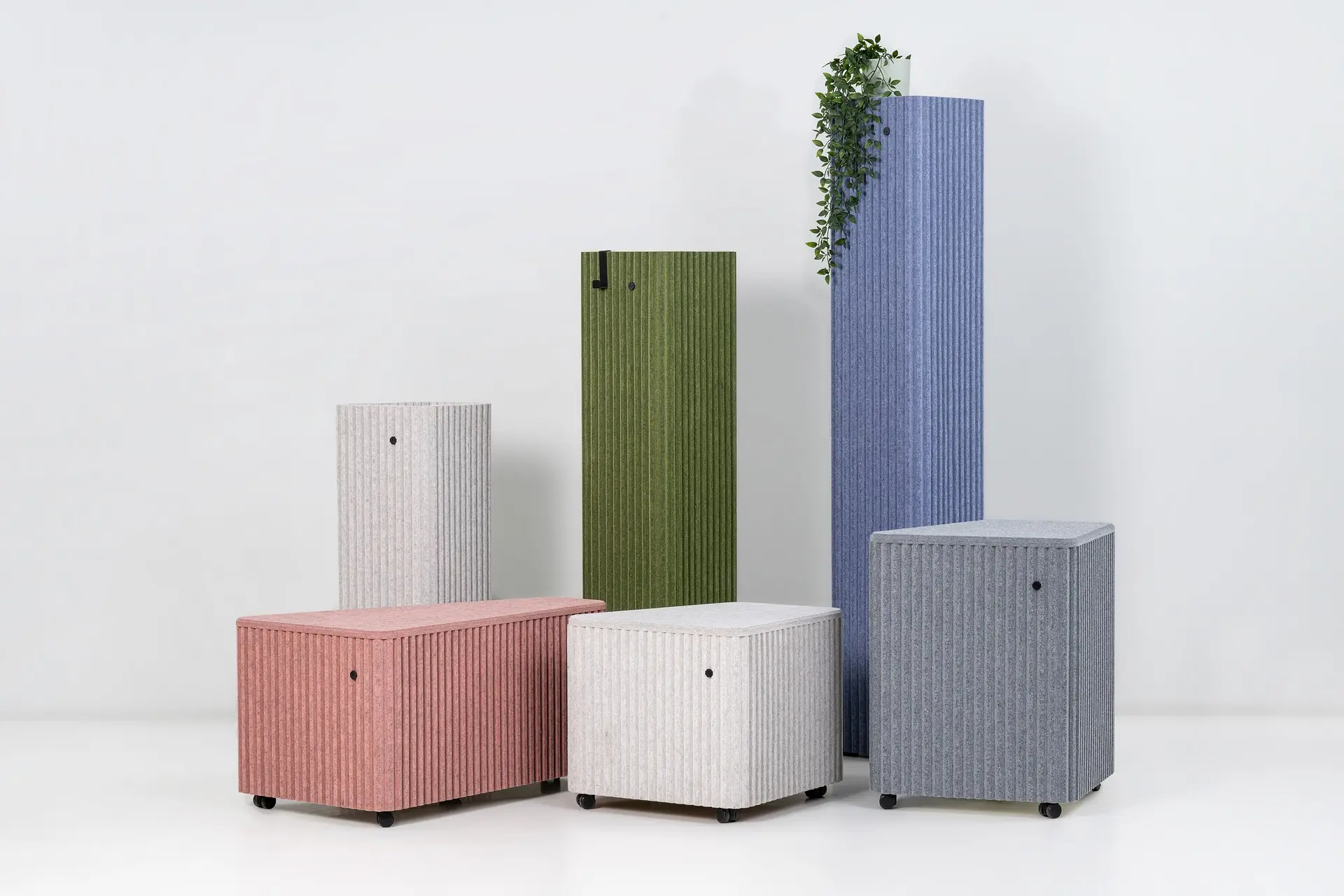 AcuTexo is an acoustic column that enhances acoustics in offices and conference rooms. Reeded felt adds the piece an elegant touch. The hooks can be used as hangers. They're available in three sizes and a variety of colors and with an optional netbox in the lowest module.