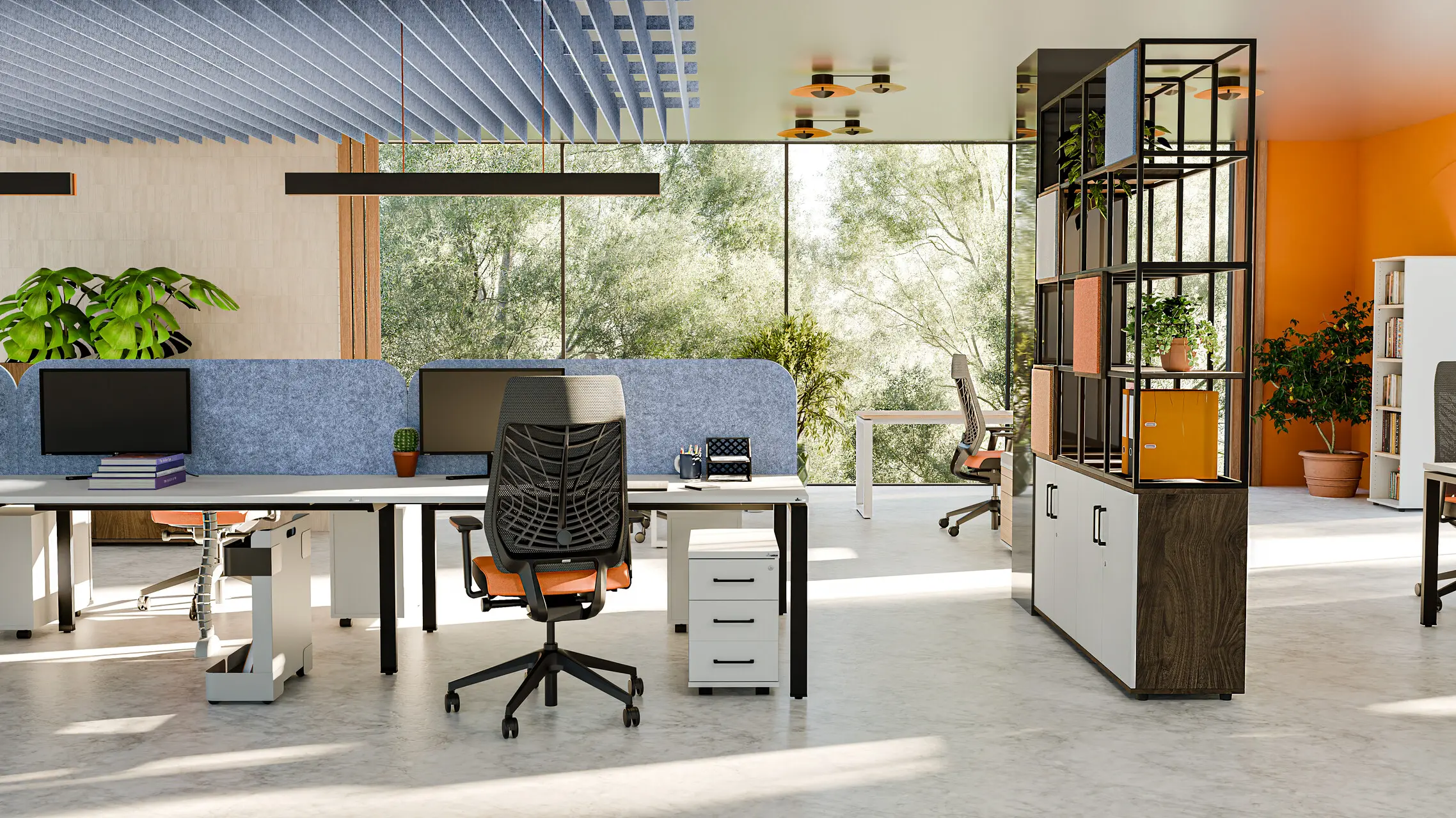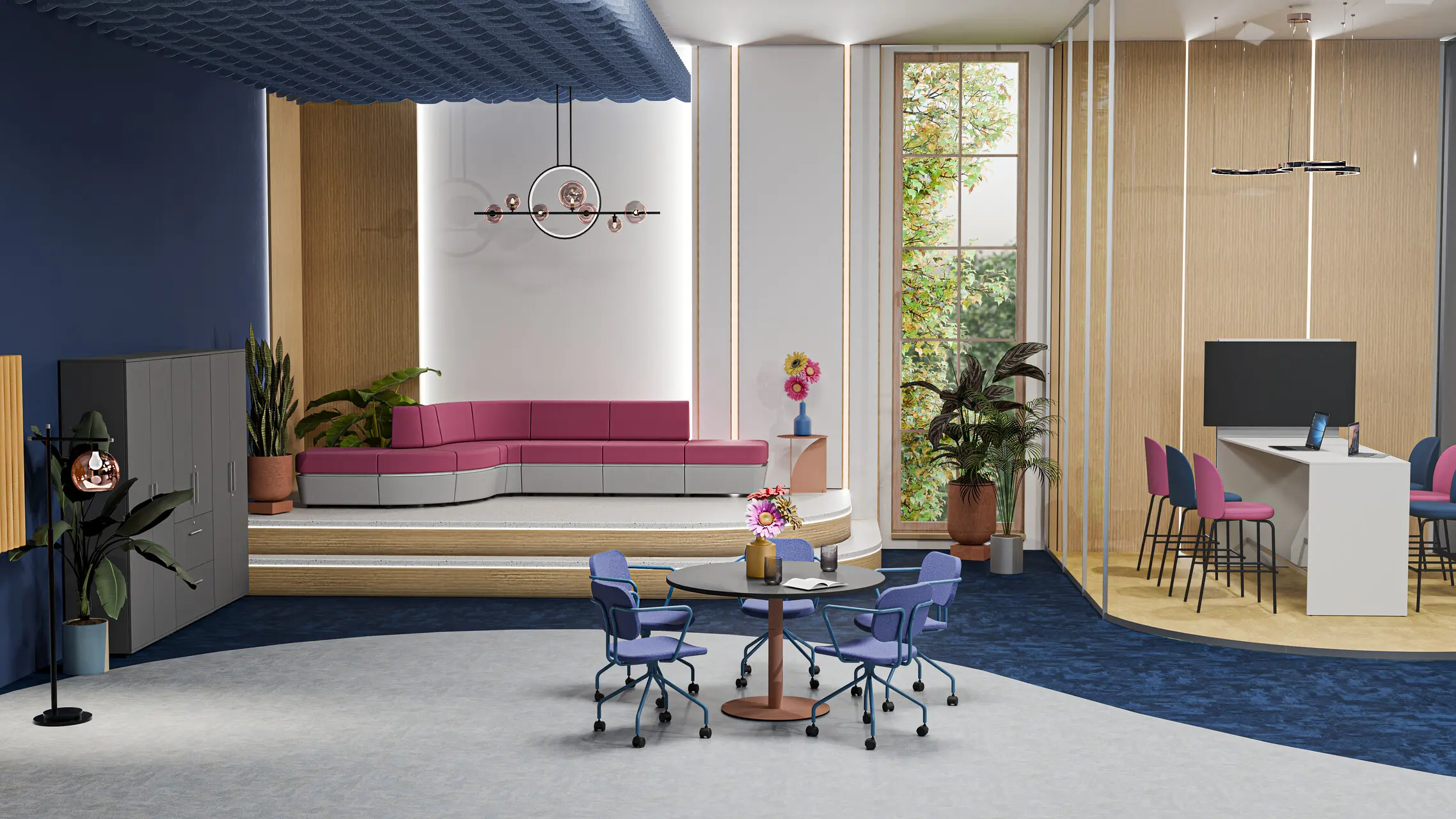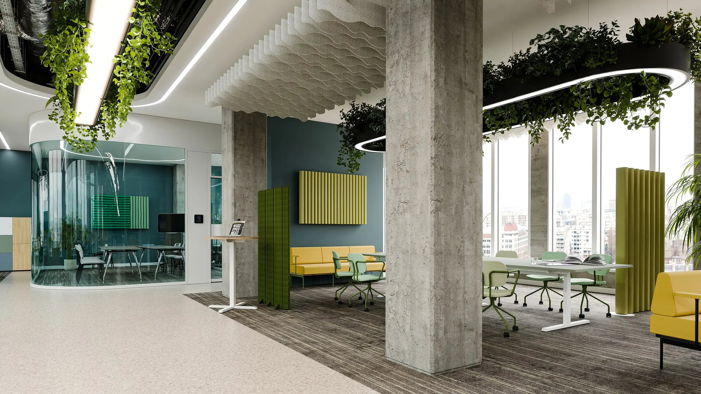 Brevo collection consists of ceiling systems that complement any space arrangement. Felt panel ceilings in two width options and several patterns to choose from will not only make the interior cozier, but also enhance the acoustics in it.