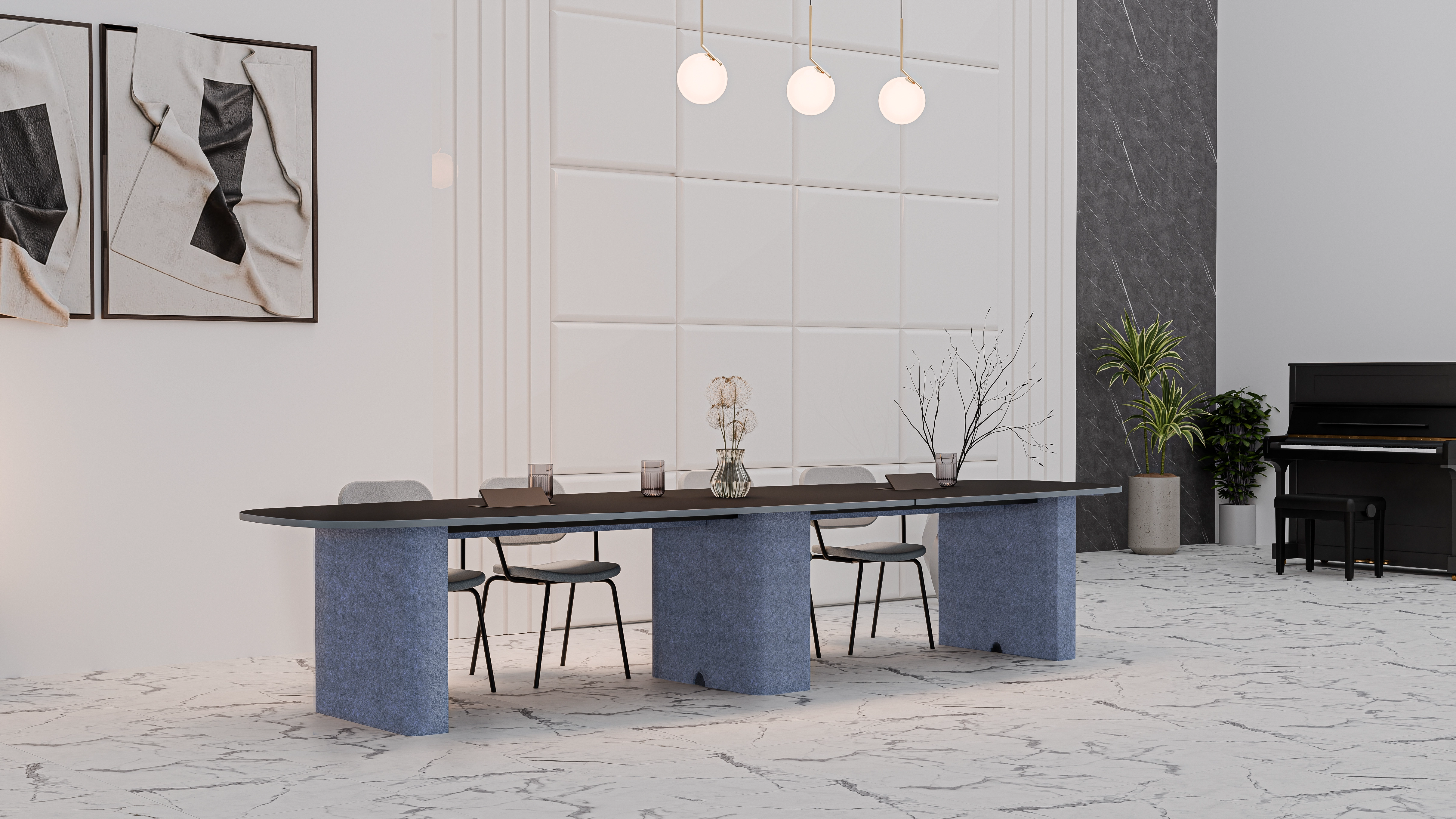 Eleganza is a multi-piece conference table that allows you to flexibly adapt the setup to the size of the room and the nature of your meetings. A stable steel frame, smart cable management and felt-finished legs ensure comfort and seamless consistency within the collection.