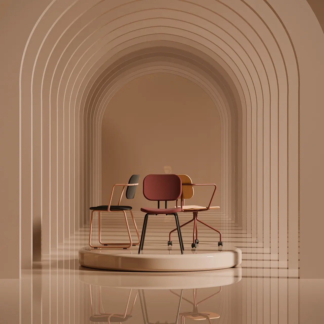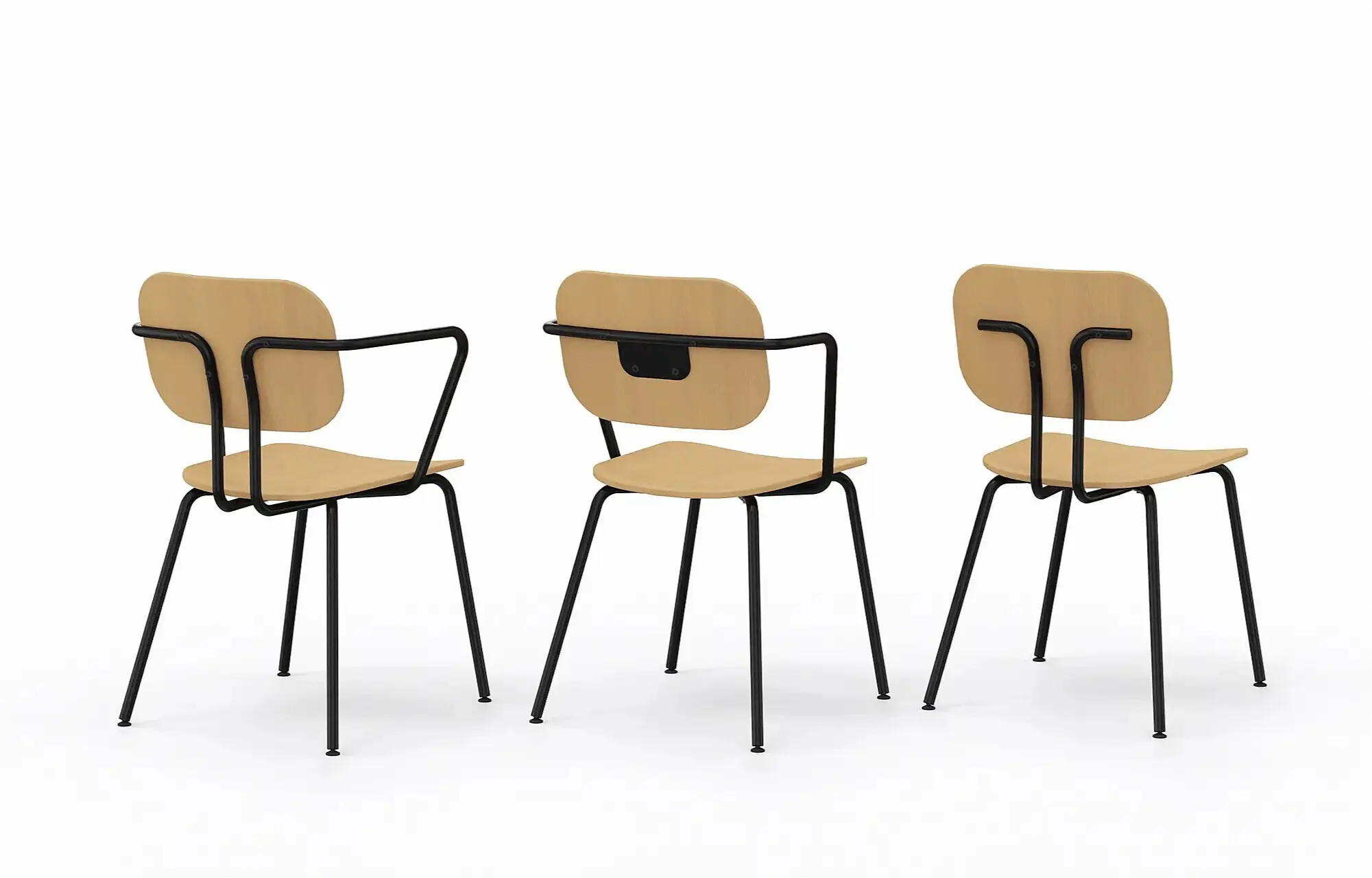 A versatile 4-leg chair with a minimalist design. Available in plywood, felt, or upholstered finish, with or without armrests. Stackable and durable.