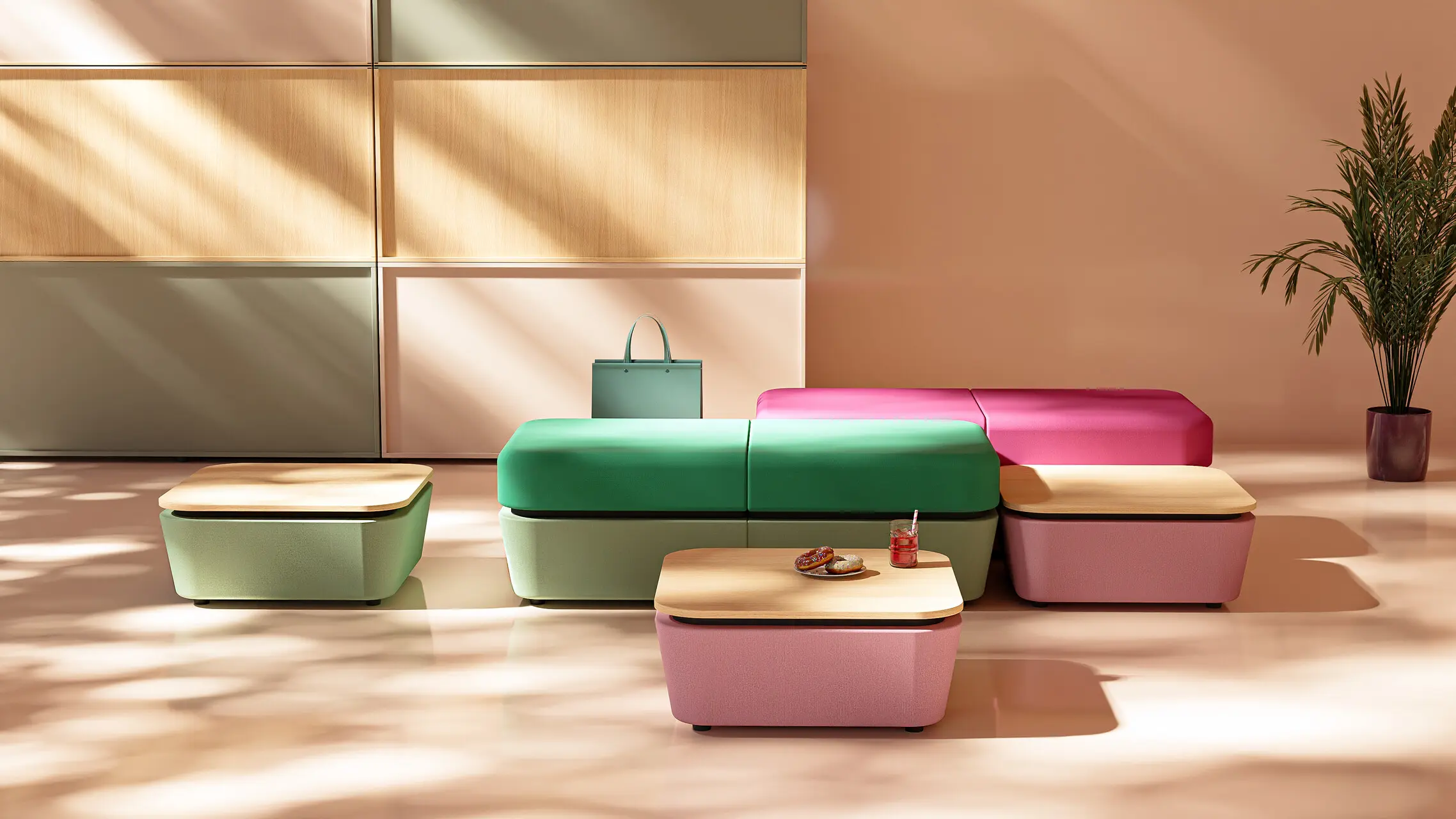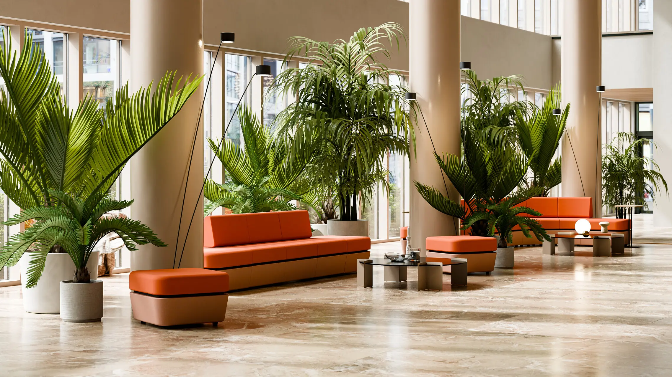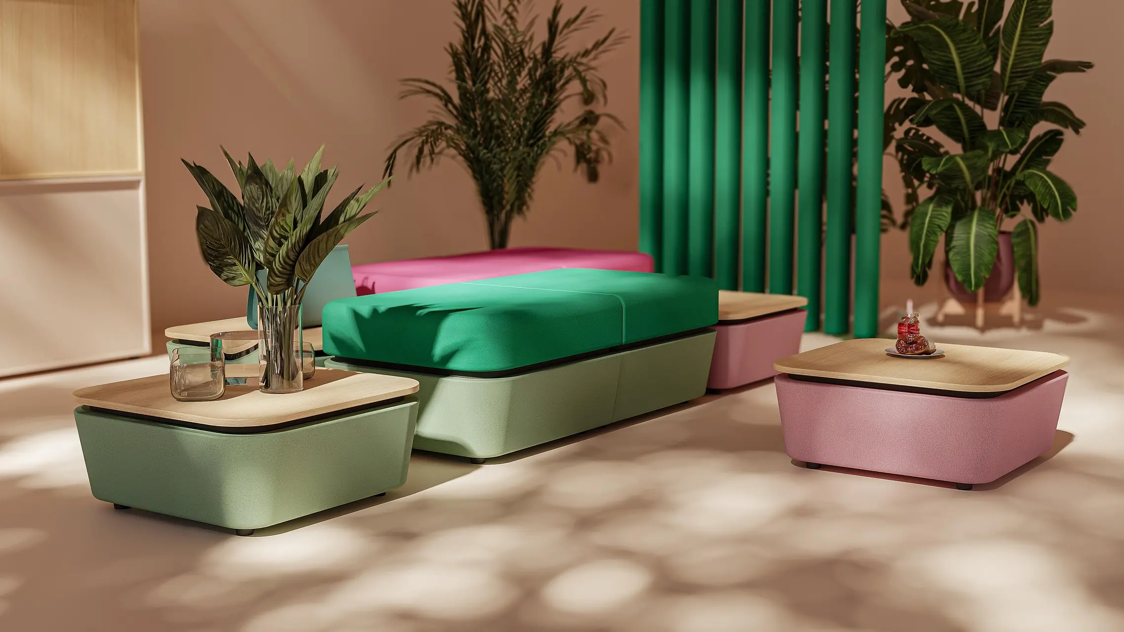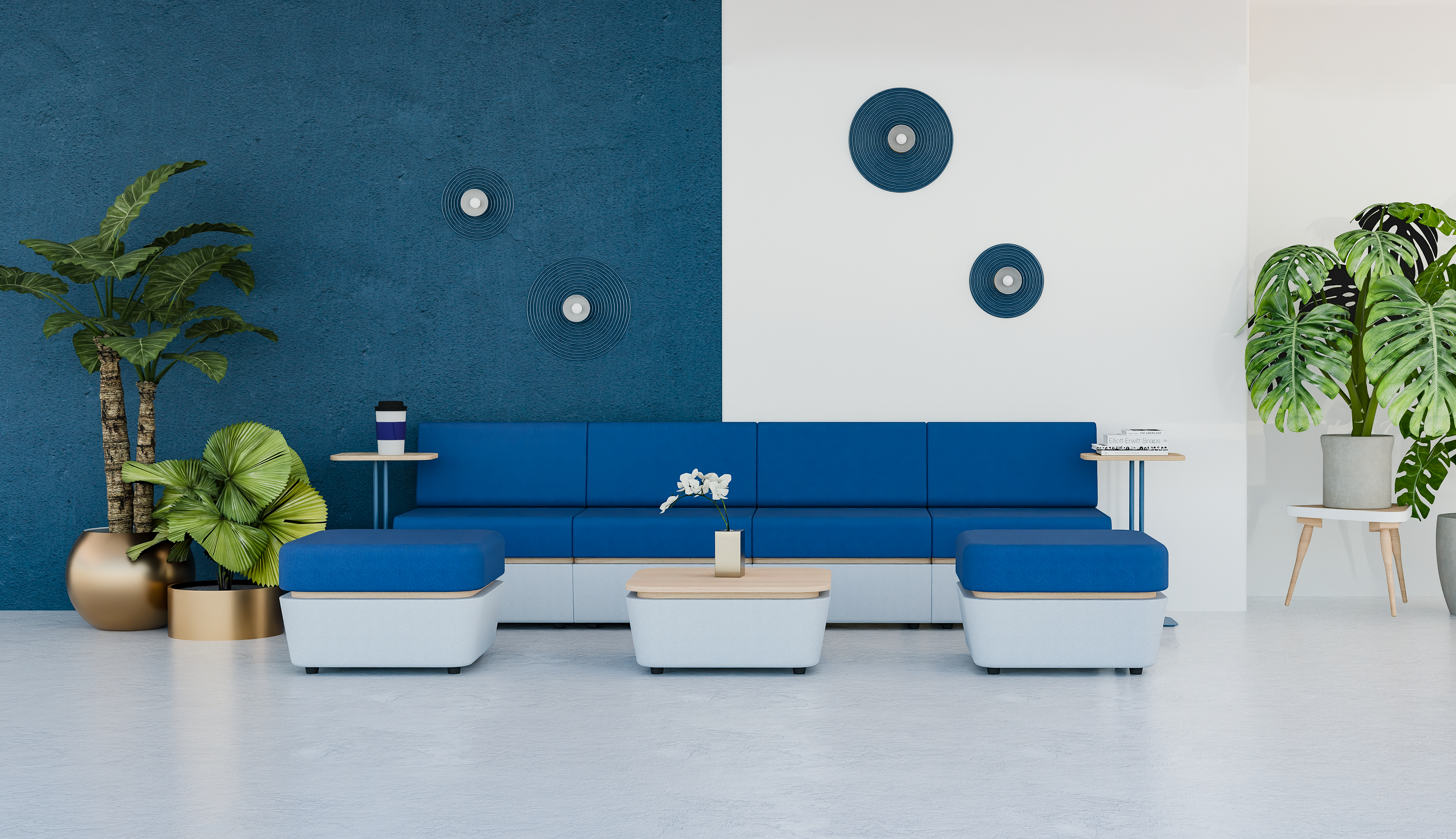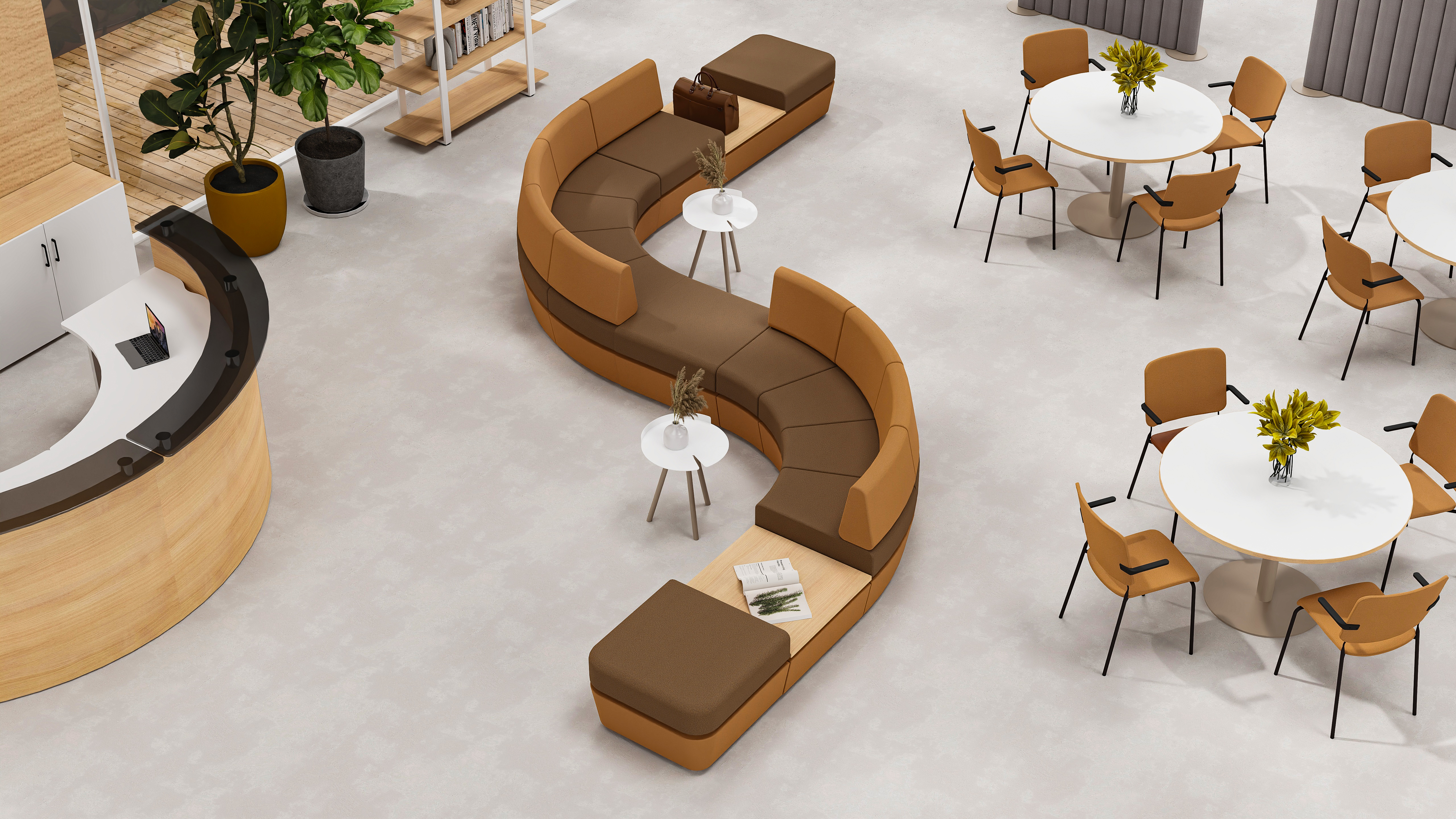 Modular sofa with an upholstered base. Elegant, flexible, and functional – perfect for receptions, lounge areas, and meeting spaces.