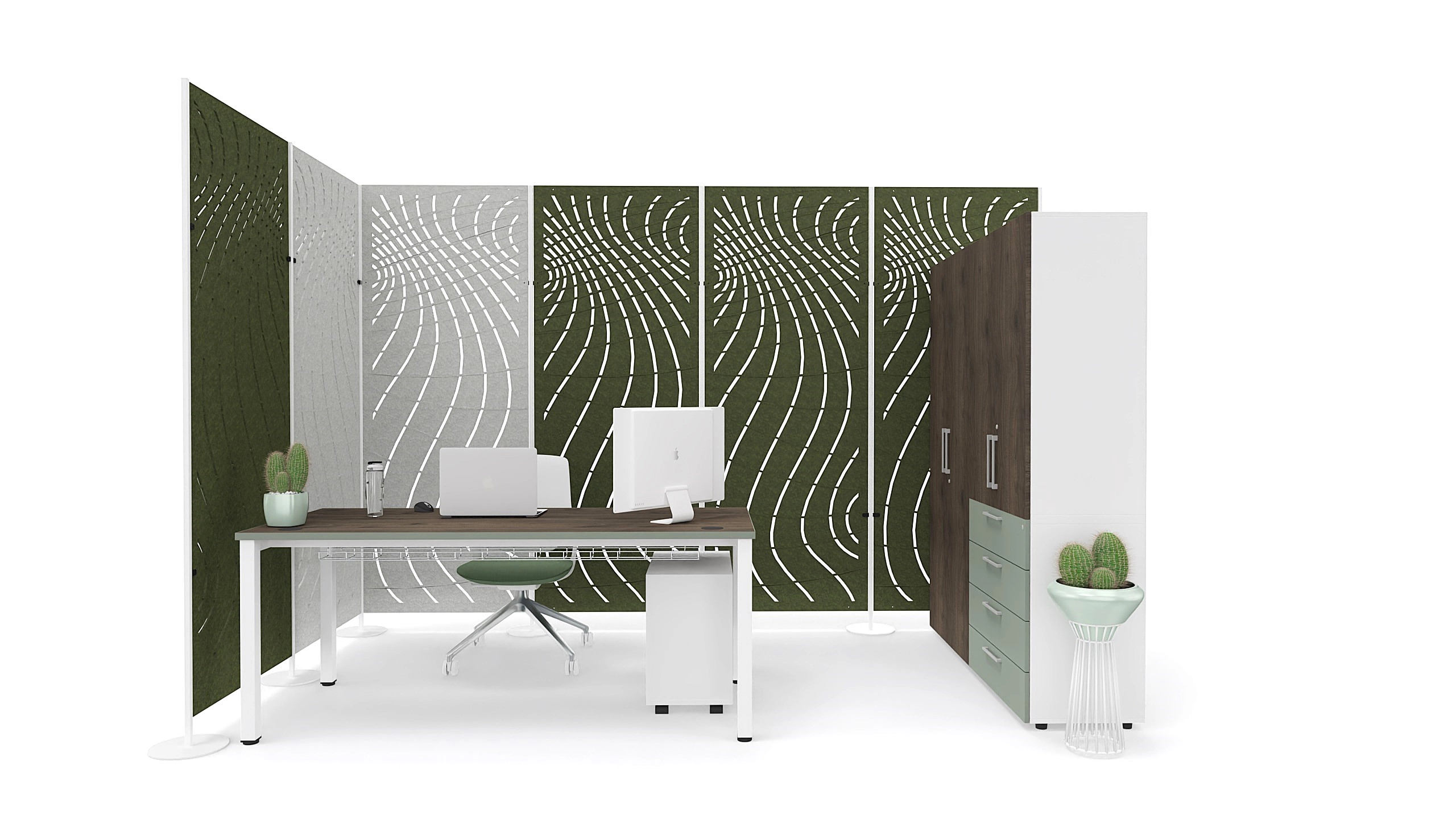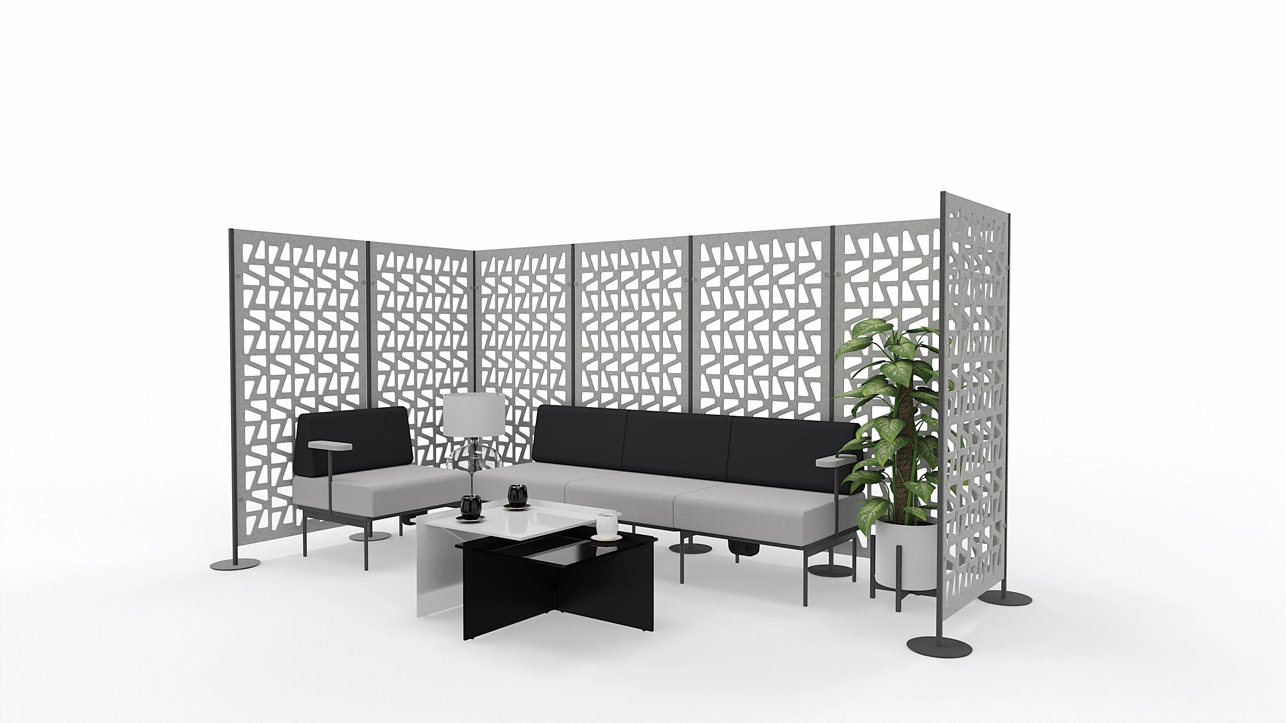 The Texo freestanding curtain enables flexible zoning of office areas without permanent construction. The modules can be easily repositioned and combined into linear or corner layouts.